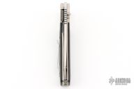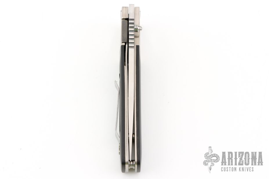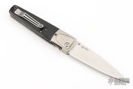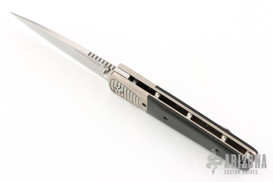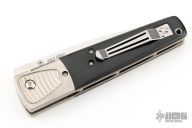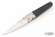 This Caledonian Edge from Cold Steel has a satin finished San Mai III stainless steel spear point blade with single thumb stud and notched thumb rest. Handle is black linen micarta over titanium liners, titanium bolsters, and lanyard hole. Excellent condition. Comes with original box and metal case.