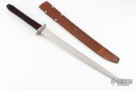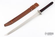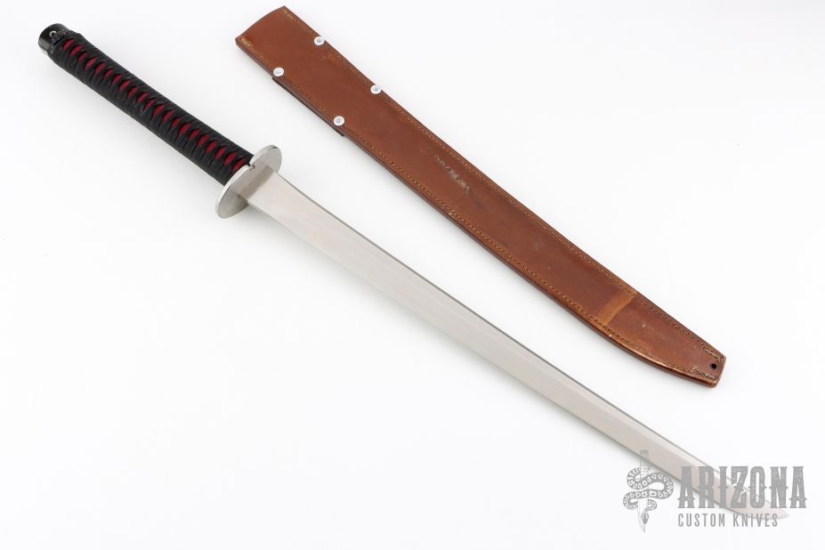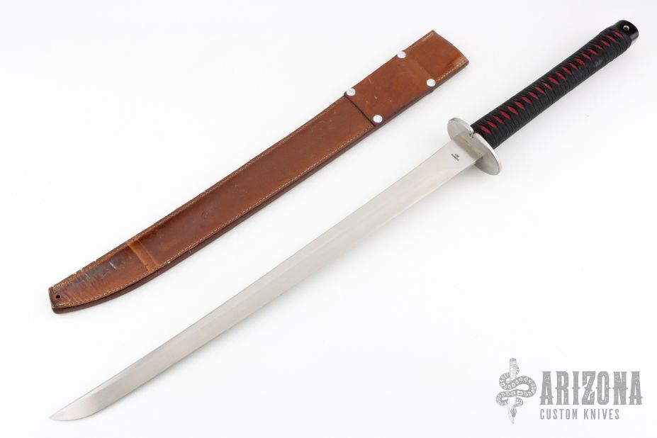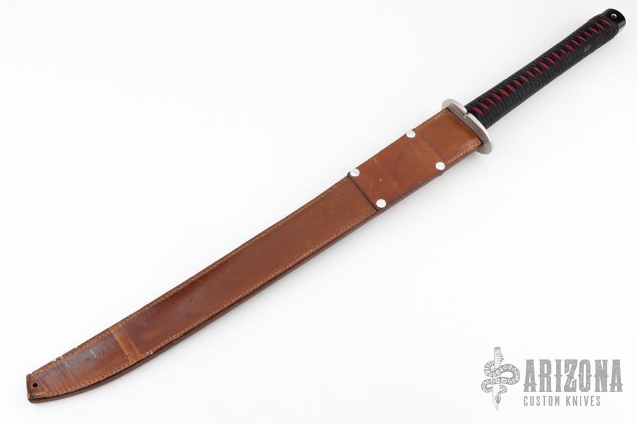 This Katana from Dawson Knives features a satin finished blade, .274" blade stock and 1.509" blade depth, full/hidden tang construction. The handle has a stainless steel tsuba ,black paracord Japanese style wrap over micarta scales. S/N 001. Includes a brown leather sheath. Excllent Condition.