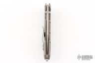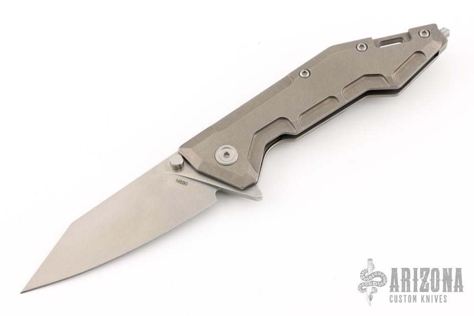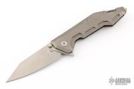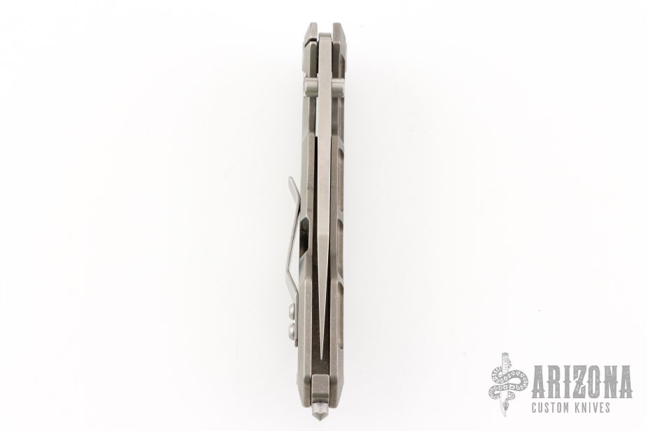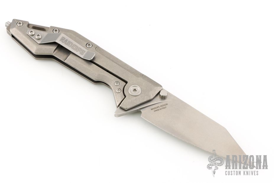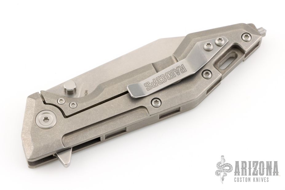 This Centauro by Raid Ops features a tumbled, clip point blade with dual thumbstuds and a flipper. The handle has a tumbled and milled titanium frame, tumbled titanium backspacer, steel glass breaker at the butt and a tip up tumbled stainless steel clip. Comes with original box, sheath and papers. New from maker.