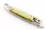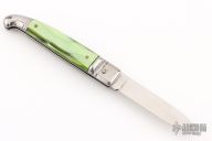 This leverlock auto features a high satin finished blade with a stainless spring. The handle has stainless bolsters and butt, green acrylic scales and stainless liners. Has some light scratches, otherwise excellent condition.