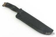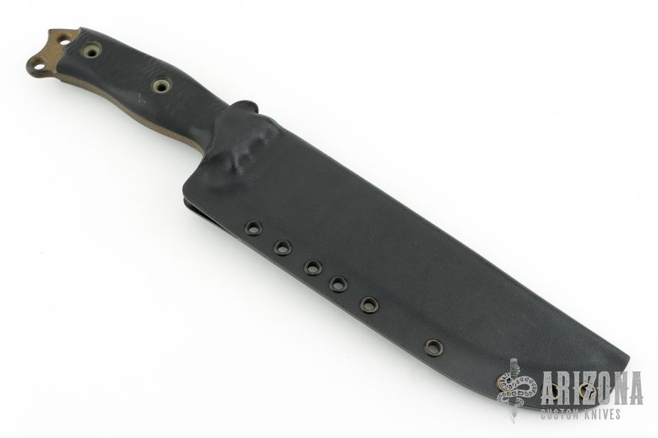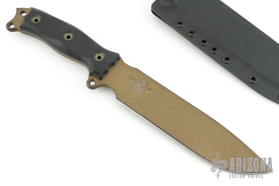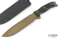 Garth's SFNO Nuclear Meltdown by Busse Combat has a bronze coated blade with .255" blade stock  1.863" blade depth, full tang construction. The handle has black G-10 scales, extended tang with lanyard holes. Comes with a custom Kydex sheath. Has a few light scuffs, otherwise excellent condition.