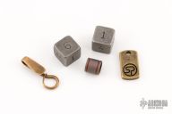 Steel Dice, Ti Bead, Brass Keychain dangler and Dogtag by Serge Panchenko, includes maker's card. Excellent condition.