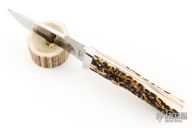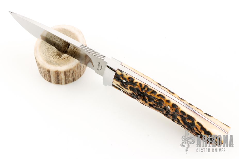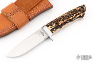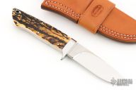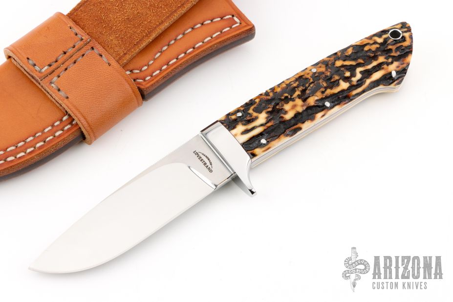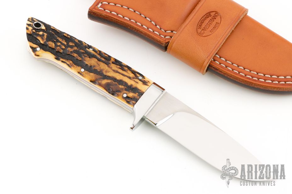This drop point hunter by Schulyer Lovestrand features a drop point blade with satin finish flats, mirror polish grinds, and notched thumbrest, .178" blade stock, 1.069" blade depth. Full tapered tang construction with stainless guard, red fiber liners, and stag handle. Beautiful fit and finish. Excellent condition. Comes with a brown leather sheath and zipper case.