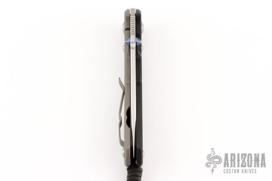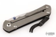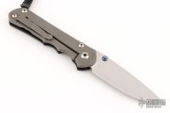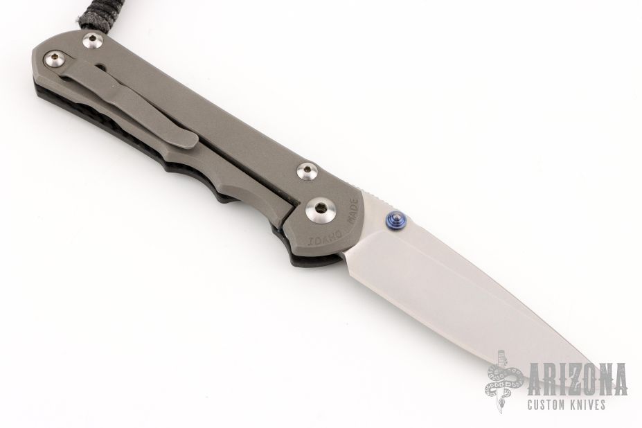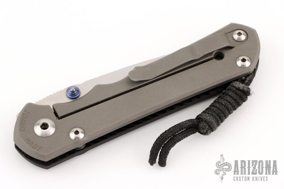 This Large Sebenza 25 by Chris Reeve Knives features a tumble finished drop point blade with dual anodized titanium thumb studs and notched thumb rest. The handle is comprised of a carbon fiber "A" side scale and a bead blasted titanium lock side with matching tip up clip over single barrel spacers. Lanyard with ring spacer bead on pommel. Includes original box, paperwork dated May 28, 2015. Excellent condition.