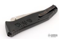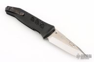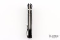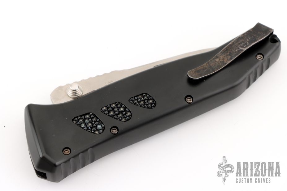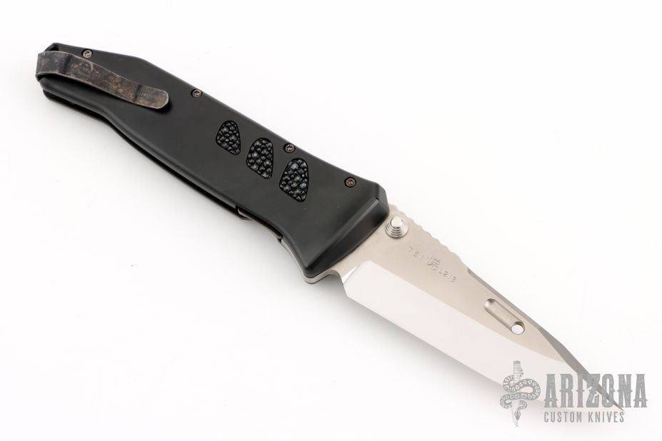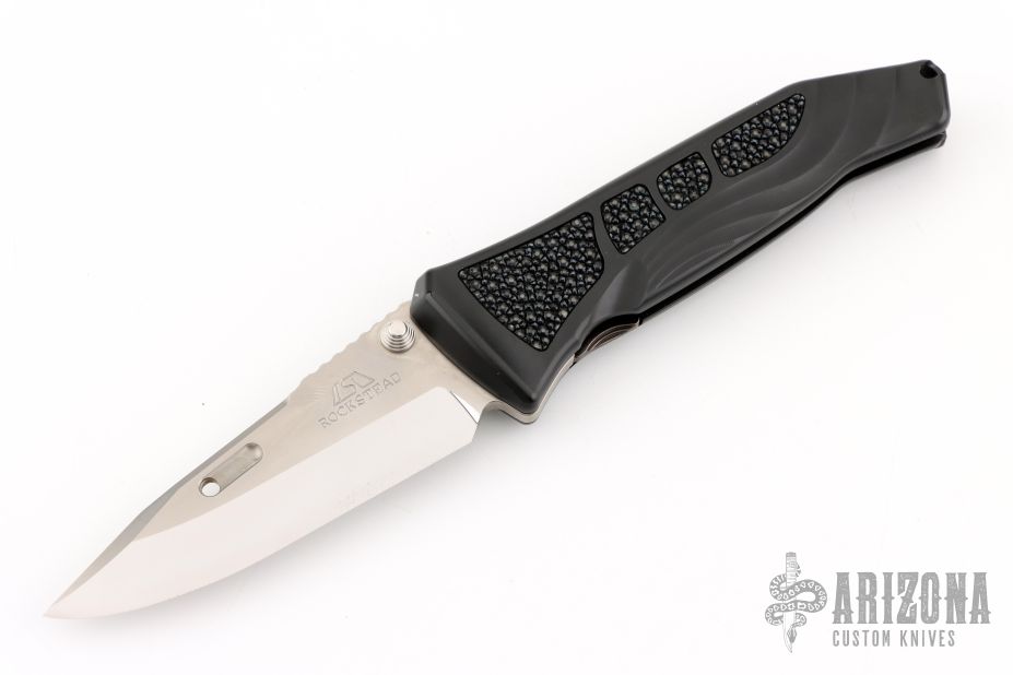 This TEI L275 by Rockstead features a mirror polished blade with a notched thumbrest and dual thumbstuds. The handle is black aluminum with rayskin inlay. Tip up black stainless steel clip and a single stainless steel liner. Comes with original box and COA dated August  02, 2016. S/N L218. Excellent condition. Has ZDP-189 blade steel which is laminated with VG-10.