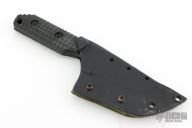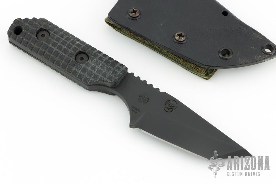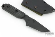 This knife by Strider Knives features a black coated tanto style blade with notched thumbrest, .191" blade stock and 1.305" blade depth, full tang construction. The handle has black G-10 scales with MEFP. Lanyard hole in pommel. Includes kydex sheath. Has a couple light scuffs, otherwise excellent condition.