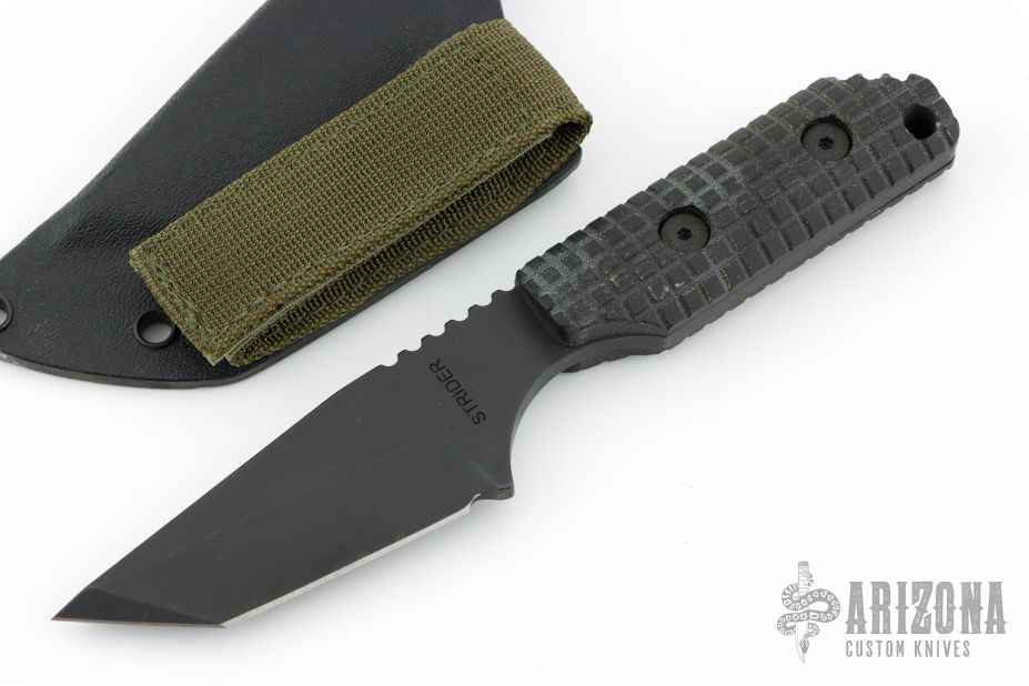 Strider Knives is a privately owned and operated company devoted solely to the development and construction of edged tools designed to survive use in the harshest of conditions. The company was founded and is currently operated by former military personnel. The initial goal was to provide a field service knife constructed with the finest components available, yet affordable to the average enlisted man and within his maintenance abilities. The initial goal having been met, Strider Knives found a ready market for custom-edged weapons and tools with the same component quality requirements as the first highly successful field knives. Many of Striders available edged tools are drawn from customer's specific design requirements. Others are simply the company's ability to look at a potential work environment and design a prototype to be tested and assessed by the workers of that environment. The background of Strider Knives founders enables the company to assess requirements in diverse fields ranging from the average line soldier/marine through special operations, law enforcement and hunting to commercial diving. Various Strider designs have met and exceeded the requirements in each of these fields.