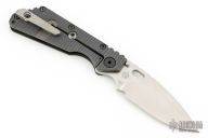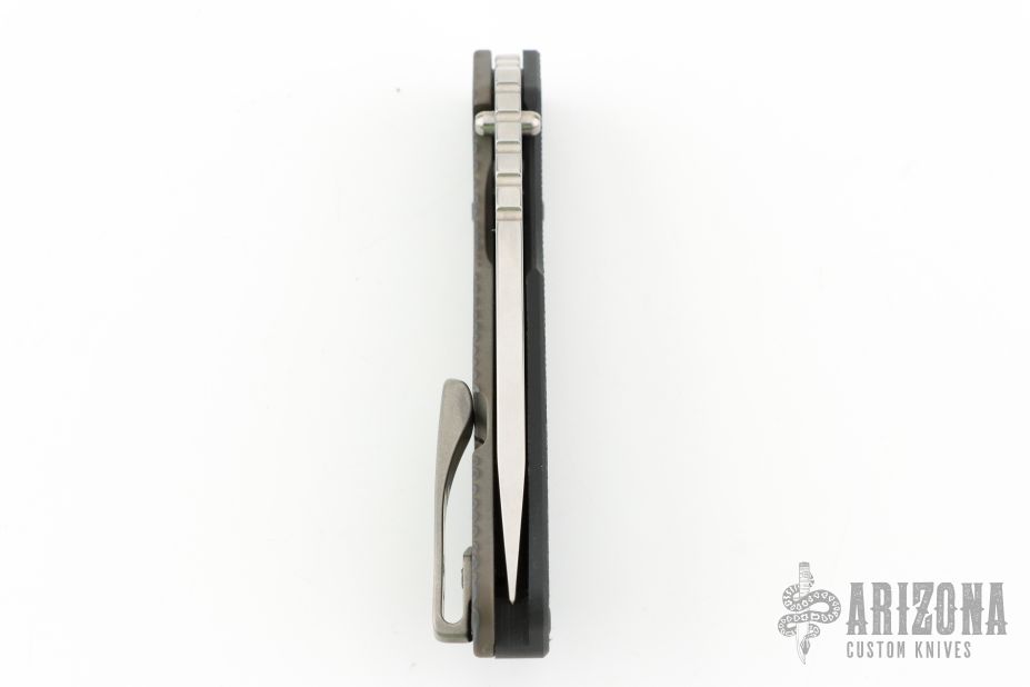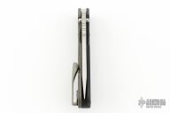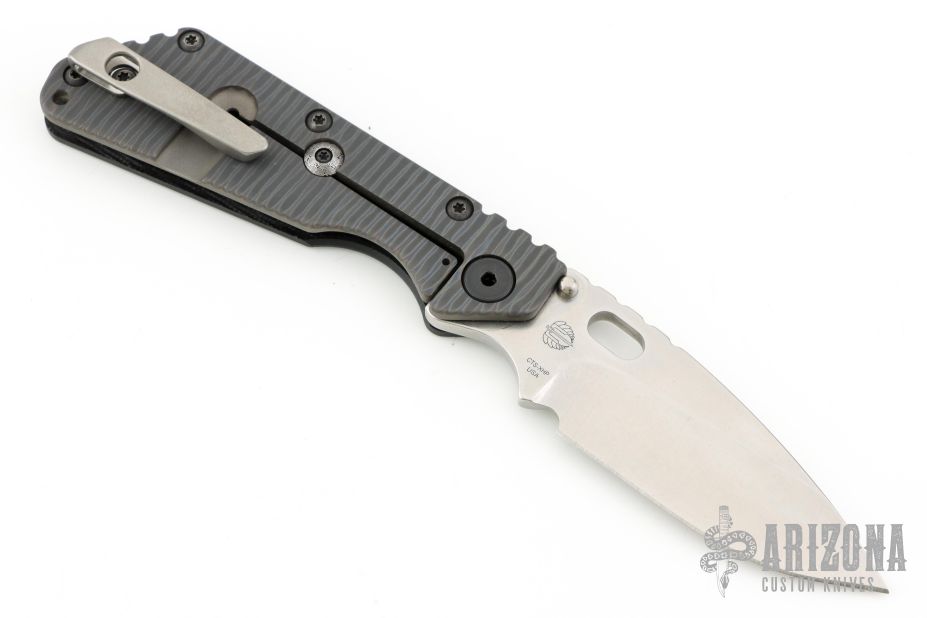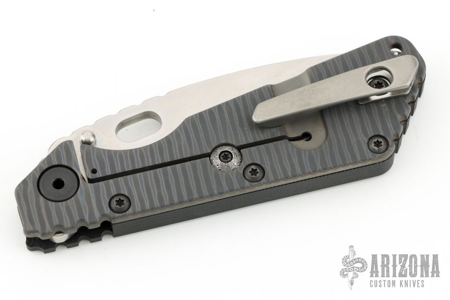 This SMF framelock folder by Mick Strider features a stonewashed drop point blade with a notched thumbrest.  The handle features a textured G-10 scale and a flamed titanium lockside with a Lynch deep carry titanium tip up pocket clip. The handle has a Pete Gray Damasteel lock bar stabilizer. Comes in a zipper case with original clip and LBS. Excellent condition.