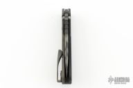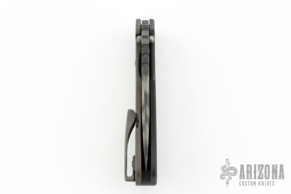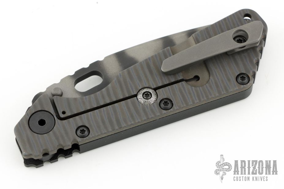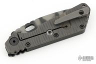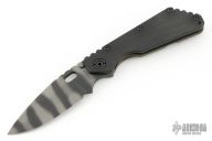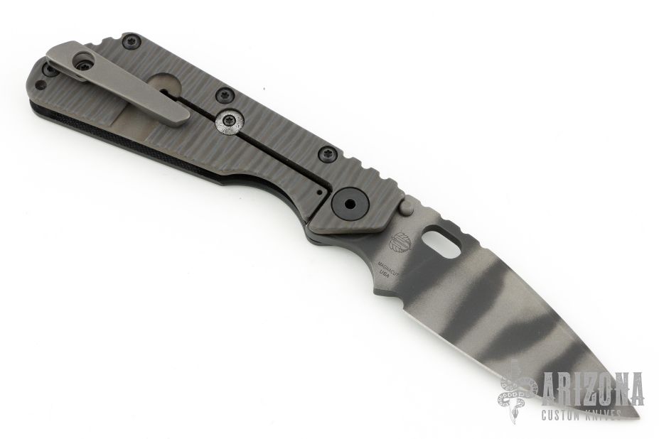 This SMF framelock folder by Mick Strider features a tiger stripe drop point blade with a notched thumbrest.  The handle features a textured G-10 scale and a flamed titanium lockside with a Lynch deep carry titanium tip up pocket clip. The handle has a Pete Gray Damasteel lock bar stabilizer. Comes in a zipper case with original clip and LBS. Excellent condition.
