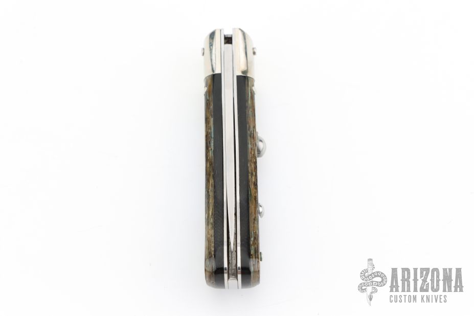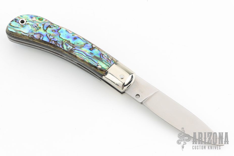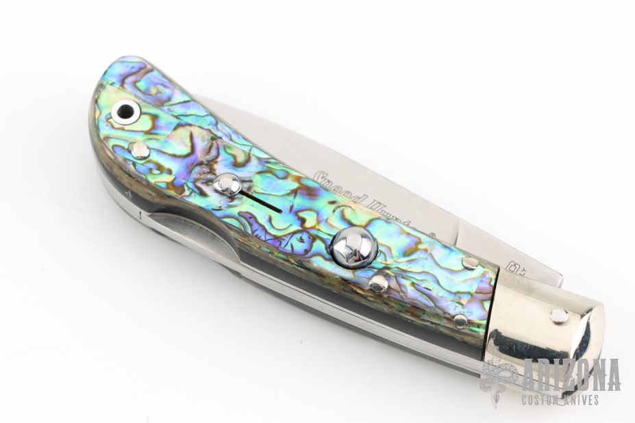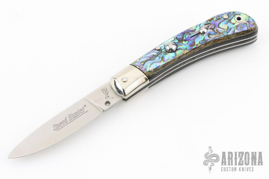 This Speed Hunter has a mirror polished blade, high polish nickel silver bolsters, and abalone scales, stainless steel liners. Well made with quick strong action. Slide safety switch, is a little loose. Has some light scratches, excellent condition otherwise.