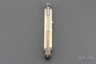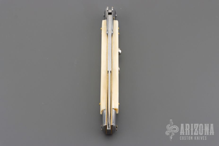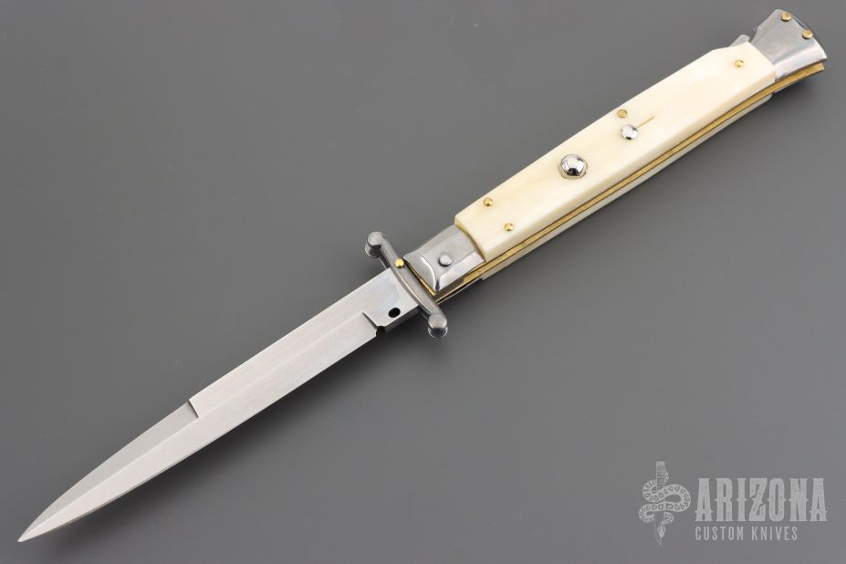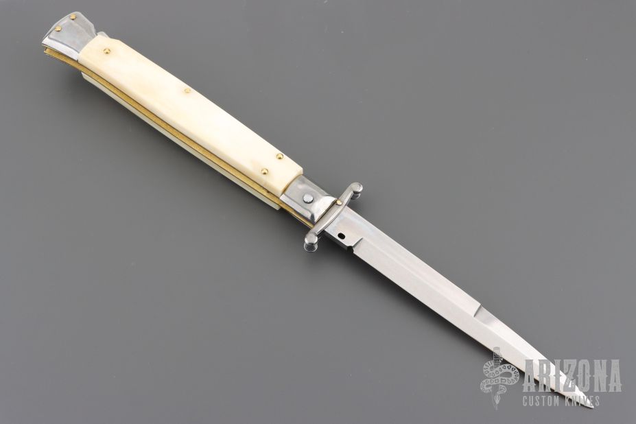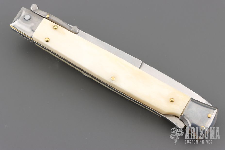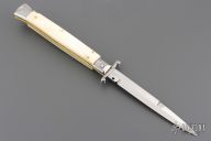 This 11" Swing Guard Auto by Frank Beltrame features a polished bayonet ground blade with false top edge. File work on the blade spine and backstrap. The handle has stainless steel bolsters, front and rear, white bone scales, brass liners, stainless spring. Excellent condition.