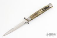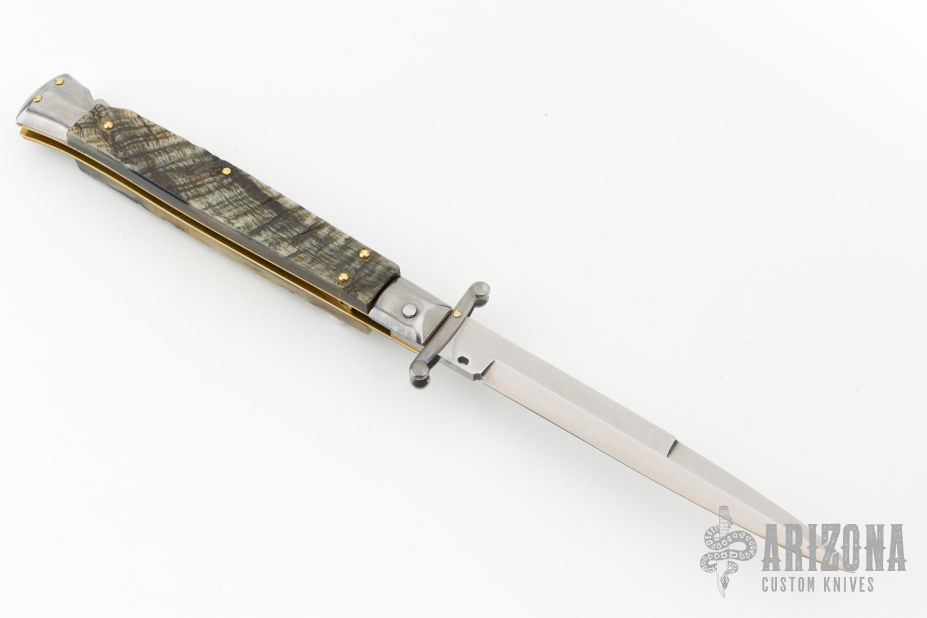 This 11" Swing Guard Auto by Frank Beltrame features a polished bayonet ground blade with false top edge. File work on the blade spine and backstrap. The handle has stainless steel bolsters, front and rear, sheep horn scales, brass liners, stainless spring. Excellent condition.