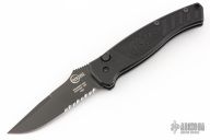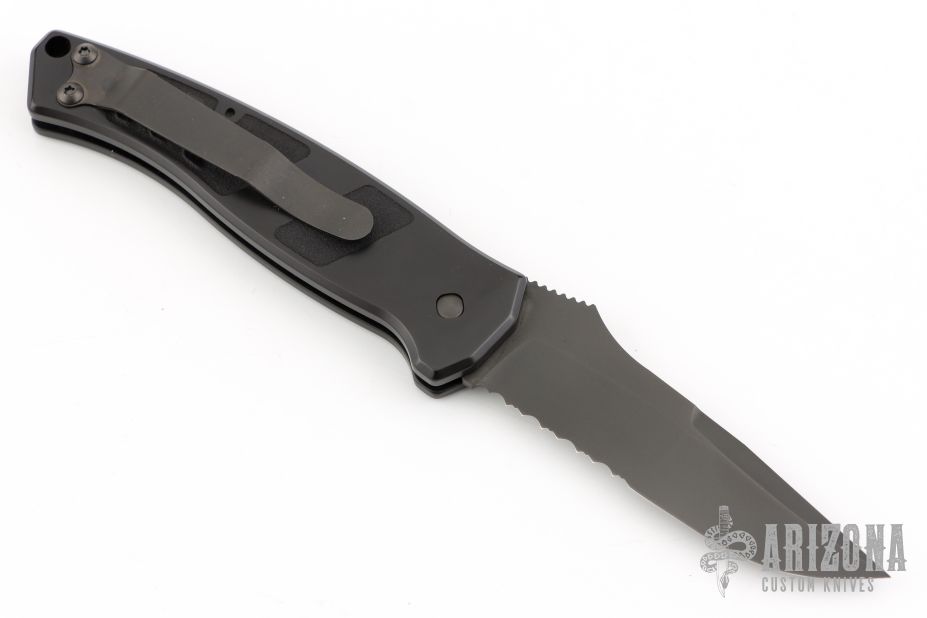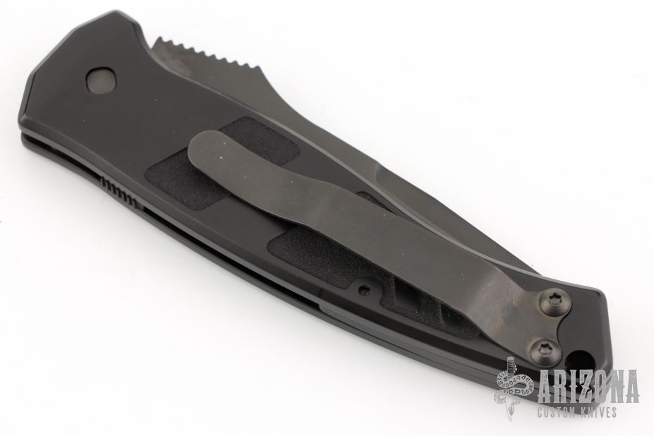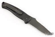 This SigTac auto features a black clip point partially serrated blade with notched thumbrest and a false top edge. The handle has a black aluminum frame and black tip up stainless steel clip. Excellent condition. Comes with original box.
