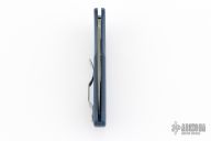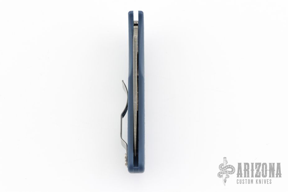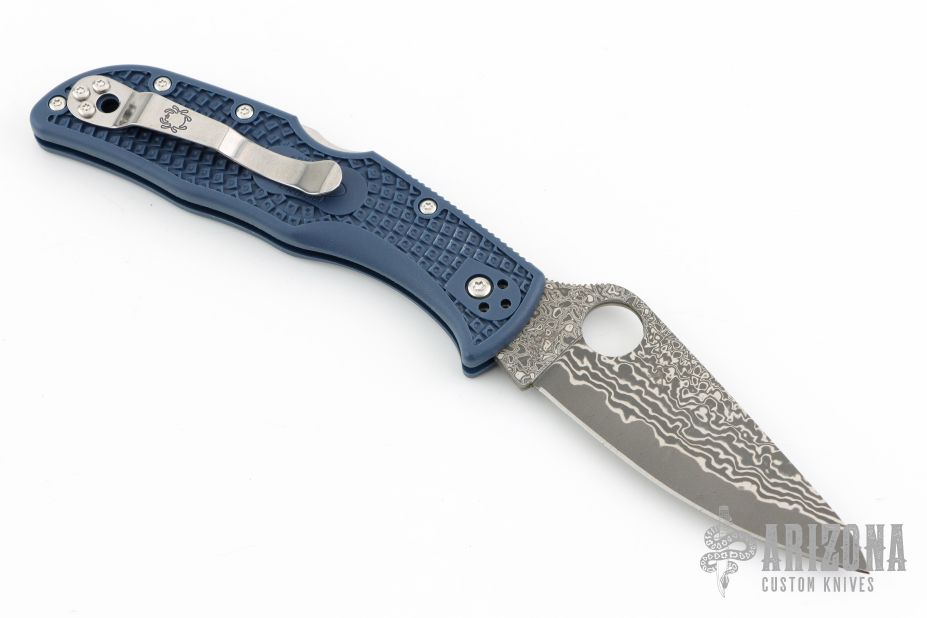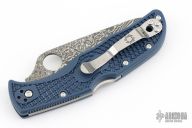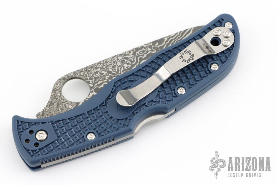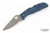 This Endela by Spyderco features a VG-10 core San Mai Damascus blade with thumbhole and notched thumbrest. The handle has blue FRN scales with stainless steel subframe and 4-way reversible clip. Comes with original box and papers. New condition.
