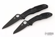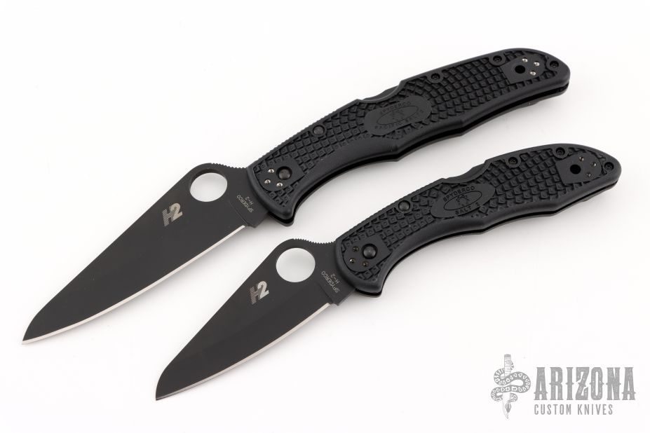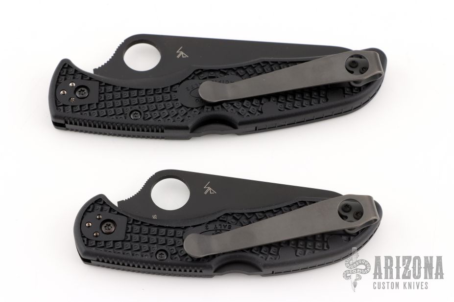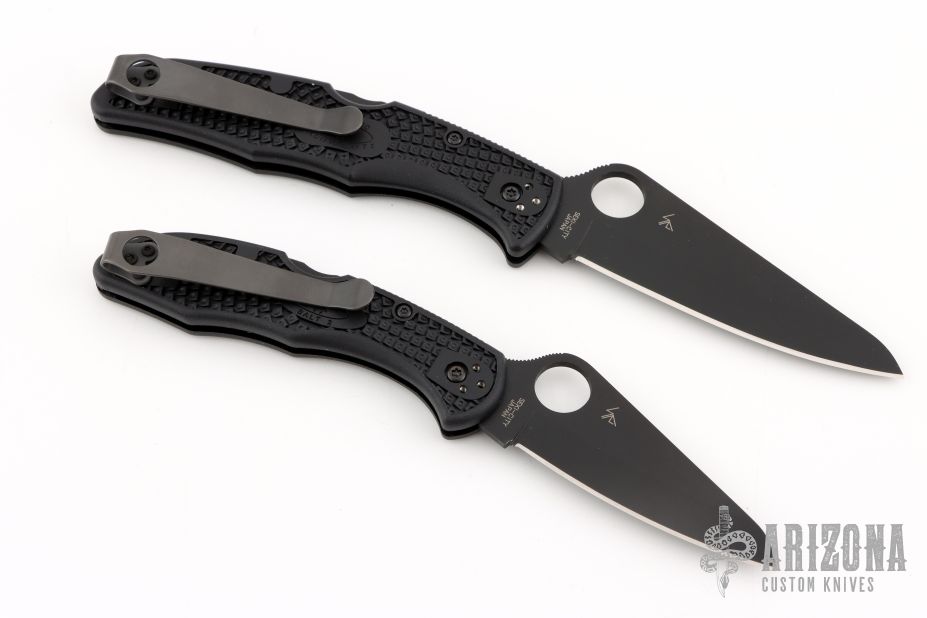 Matched set of H-2 Spyderco knives with black blades, thumbhole, notched thumb ramps, black FRN covers, and LynchNW deep carry clips. No boxes or original clips included. Excellent condition.