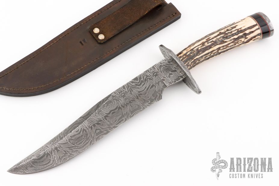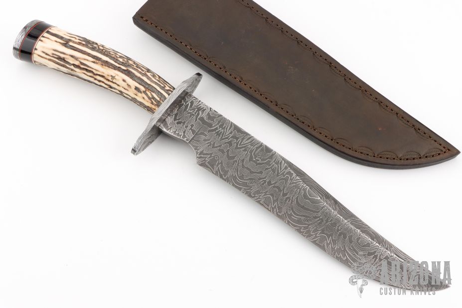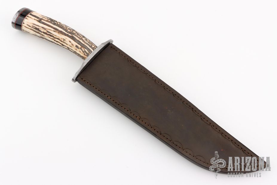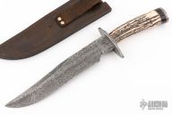 This Bowie from Stek Knives features a Mosaic Damascus blade with sharpened top edge, .204" blade stock and 1.848" blade depth, hidden tang construction. The handle has a Damascus double guard, stag grip, buffalo/red/nickel silver spacers with a Damascus pommel. Includes a hand tooled brown leather sheath, zippered case and COA dated July 2009. Excellent condition.