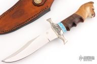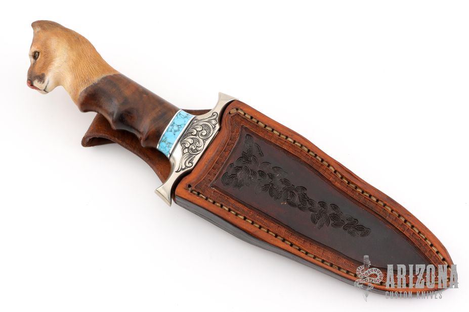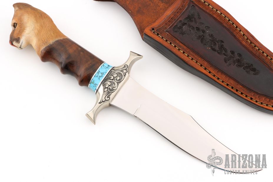 This knife by RD Nolen features a mirror polished blade with sharpened top edge, .184" blade stock and 1.429" blade depth, hidden tang construction. The handle has an engraved nickel silver guard, walnut grip with carved lions head at the butt, white/black/aluminum/turquoise spacers. Comes with a hand tooled brown leather sheath. Excellent condition.