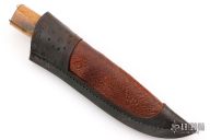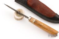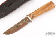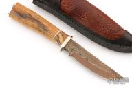 This Hunter by Herb Derr features a Damascus blade with fileworked spine, .166" blade stock and 1.120" blade depth, hidden tang construction. The handle is comprised of a nickel silver guard with spalted maple and nickel silver spacers and a walrus jaw bone grip, nickel silver butt. Includes a brown leather sheath with exotic skin inlay. Excellent condition. Comes with COA