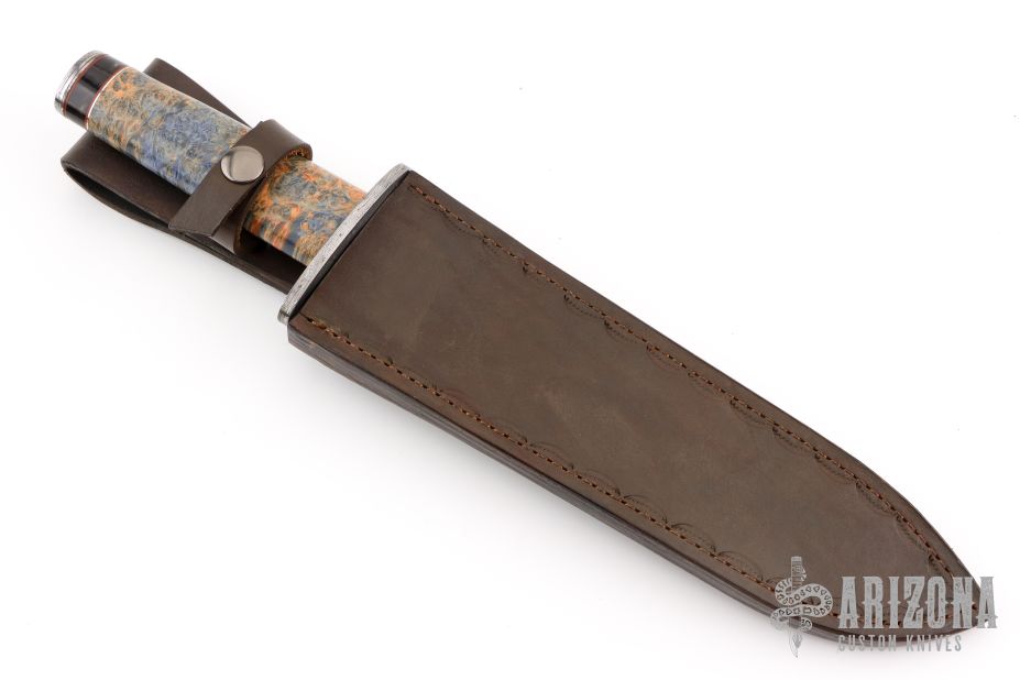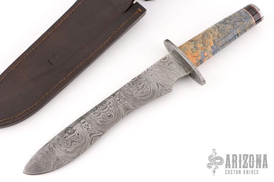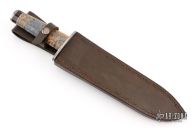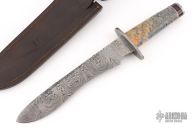 This Mamba from Stek Knives features a Mosaic Damascus blade with false top edge, .157" blade stock and 1.728" blade depth, hidden tang construction. The handle has a Damascus double guard, buckeye burl wood grip, buffalo/red/nickel silver spacers with a Damascus pommel. Includes a hand tooled brown leather sheath and COA dated July 2009. Excellent condition.
