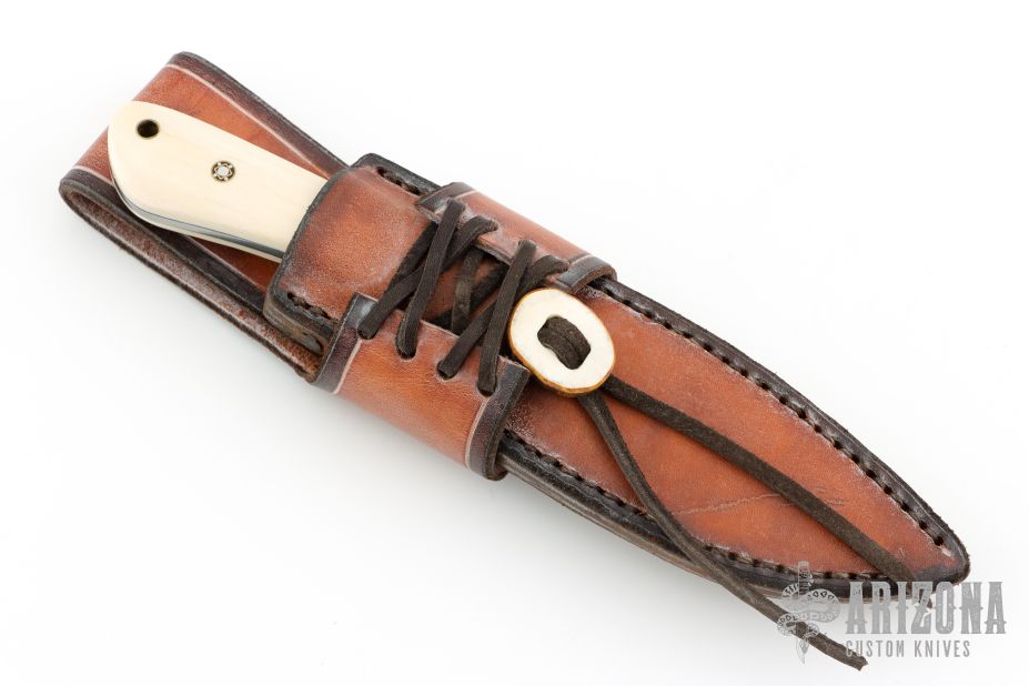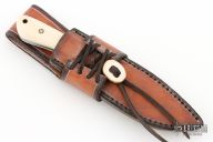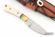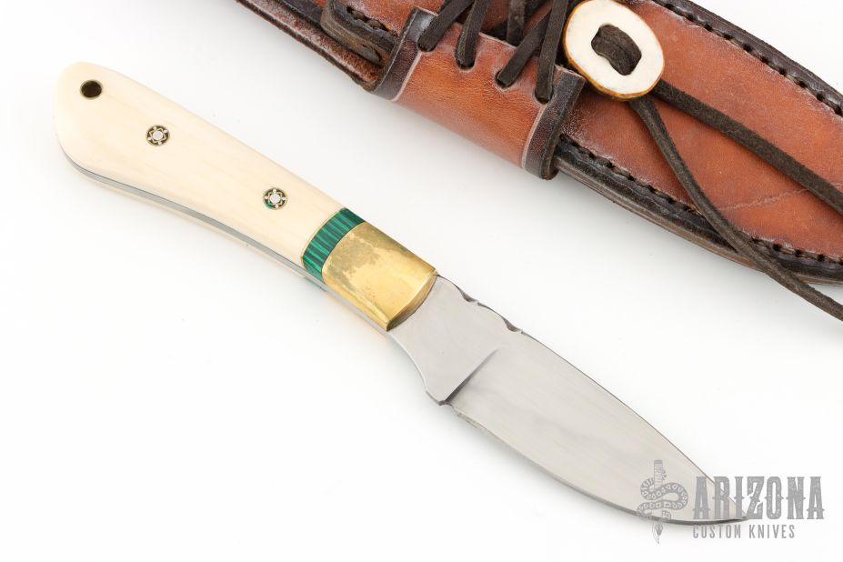 This knife by Michael Miller features a hand rub satin finished blade with nice hamon and fileworked thumbrest, .138" blade stock and 1.005" blade depth, full tang construction. The handle has dovetailed brass bolsters, moose bone scales, brass and malachite spacers and mosaic pins, fileworked tang spine. Comes with a two-tone brown leather sheath with stag concha, and a COA dated 7/4/09. Has some patina on the bolsters, otherwise excellent condition.