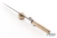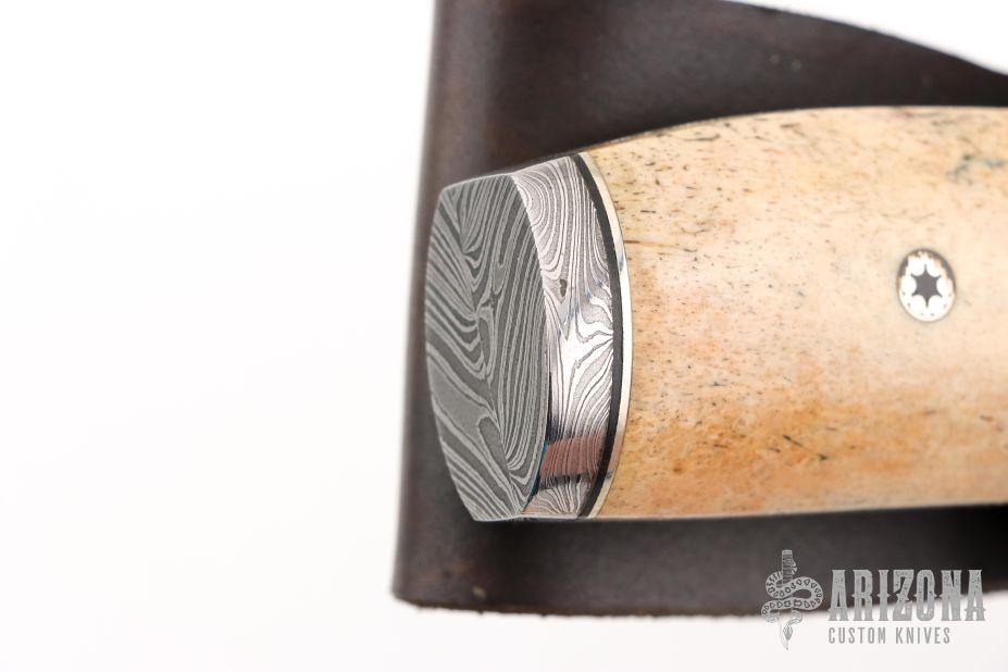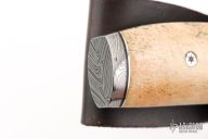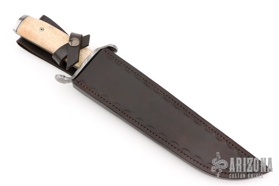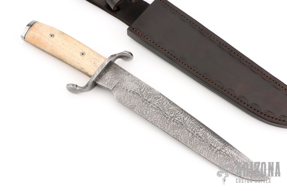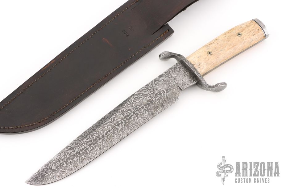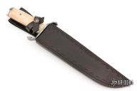 This Bowie from Stek Knives features a W-Theory Mosaic Damascus blade with false top edge, .199" blade stock and 1.674" blade depth, hidden/frame tang construction. The handle has a Damascus guard and butt, oosic scales over a Damascus frame, nickel silver/black spacers. Includes a brown leather sheath. Excellent condition. Comes with COA dated 2012