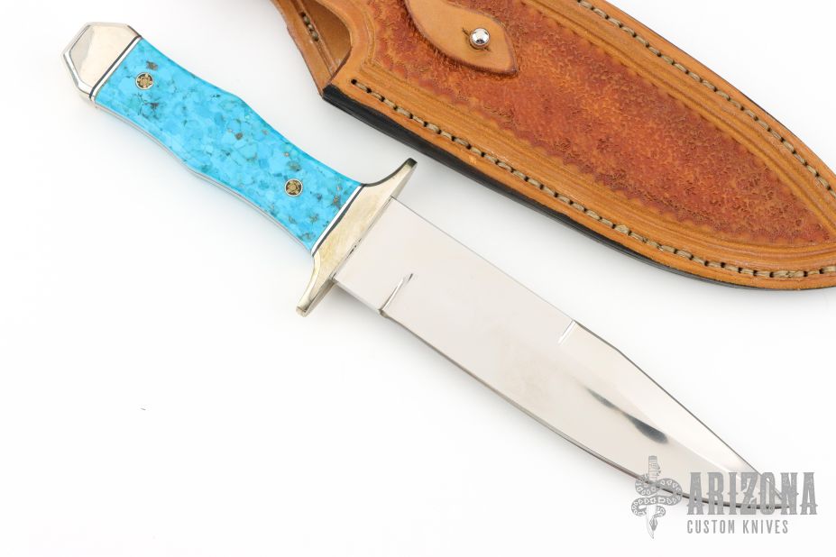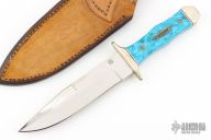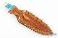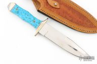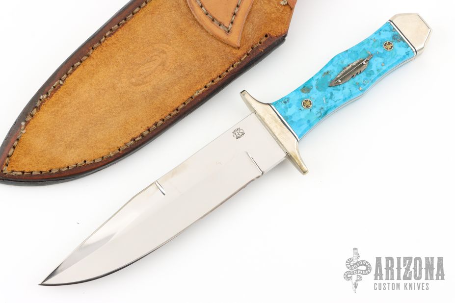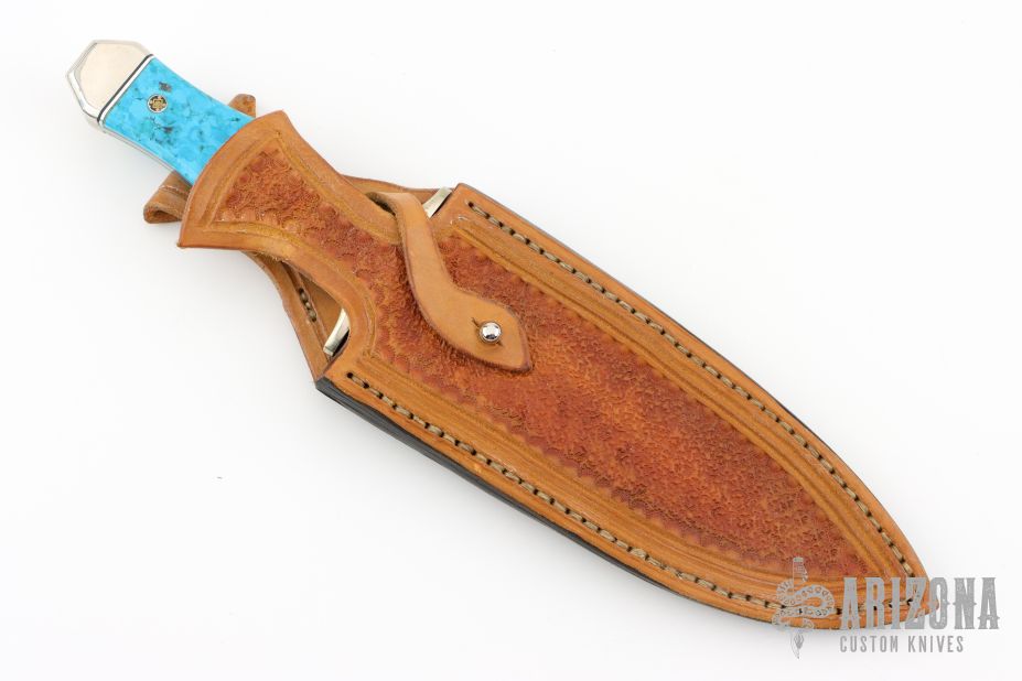 This knife by RD Nolen features a mirror polished blade with sharpened top edge, .195" blade stock and 1.485" blade depth, full tang construction. The handle has a nickel silver guard and rear bolsters, turquoise scales with mosaic pins and black liners, has a silver feather overlay. Comes with a hand tooled brown leather sheath. Excellent condition.