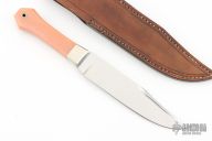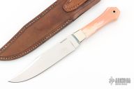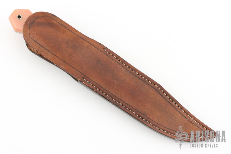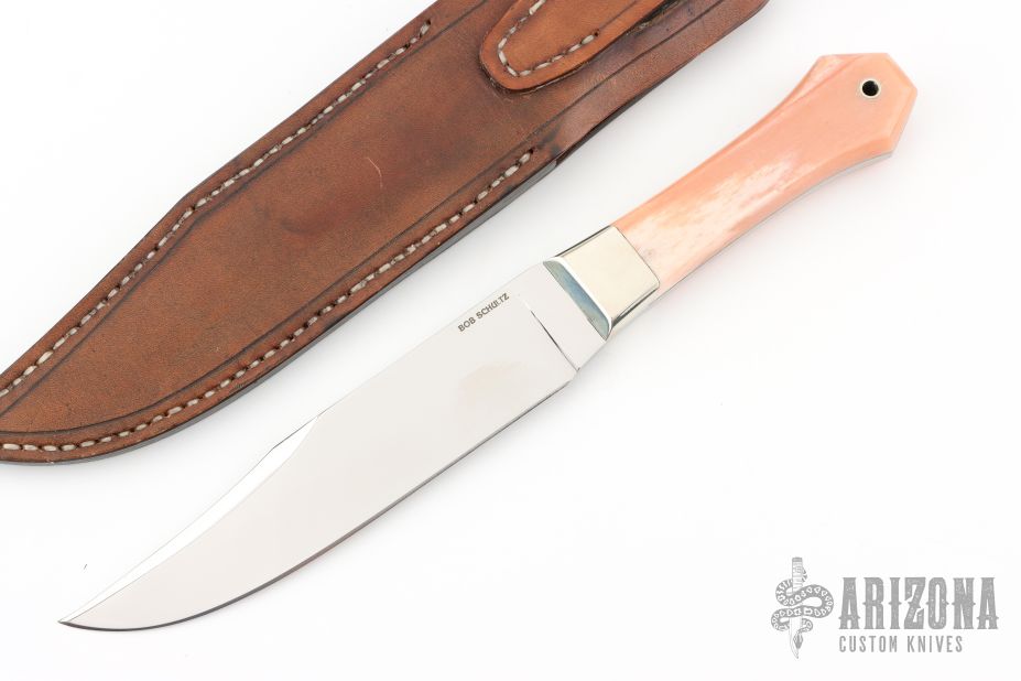 This Bowie by Bob Schultz features a mirror finished blade with sharpened top edge, .183" blade stock and 1.342" blade depth, full tang construction. The handle has dovetailed nickel silver bolsters and giraffe bone scales, lanyard hole. Comes with a brown leather sheath. Excellent condition.