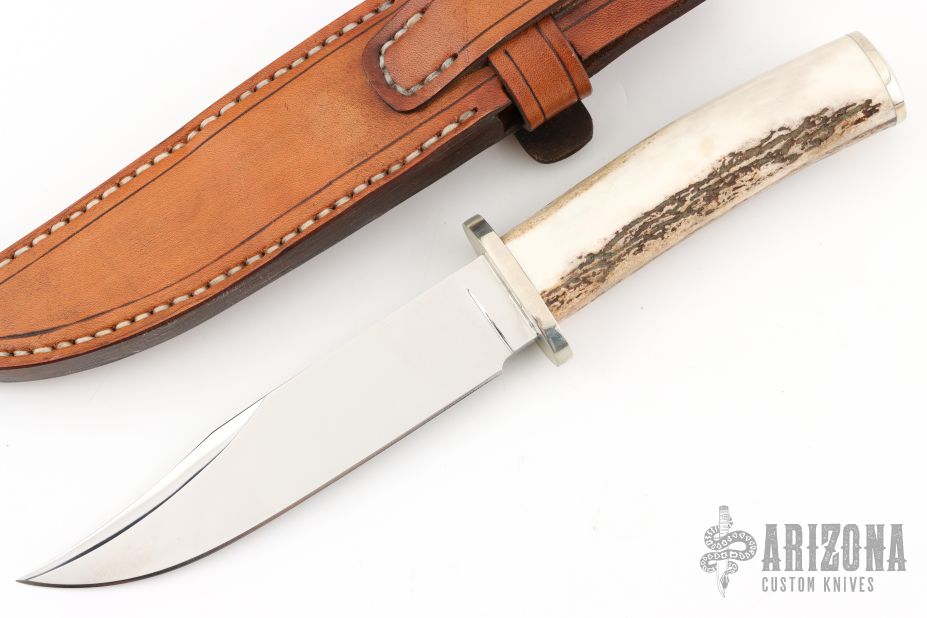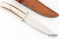 This knife by Bob Schultz features a mirror finished blade with sharpened top edge, .196" blade stock and 1.108" blade depth, hidden tang construction. The handle has a nickel silver guard and butt with a stag grip. Comes with a brown leather sheath. Excellent condition.