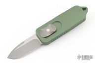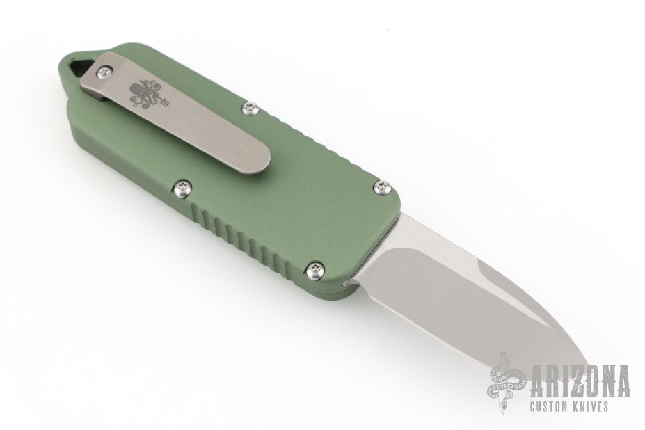 This OTF by Prometheus Design Werx, and Darriel Caston features a two-tone satin and bead blast blade with swedge. The handle is green aluminum with a tip down stainless steel clip. Comes with a zippered case and box. Excellent condition.