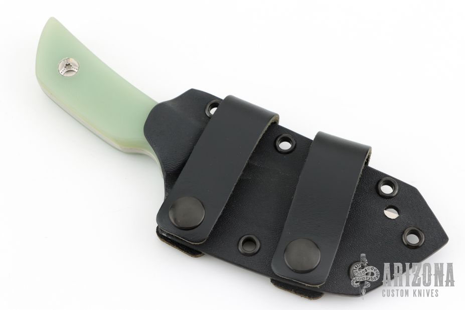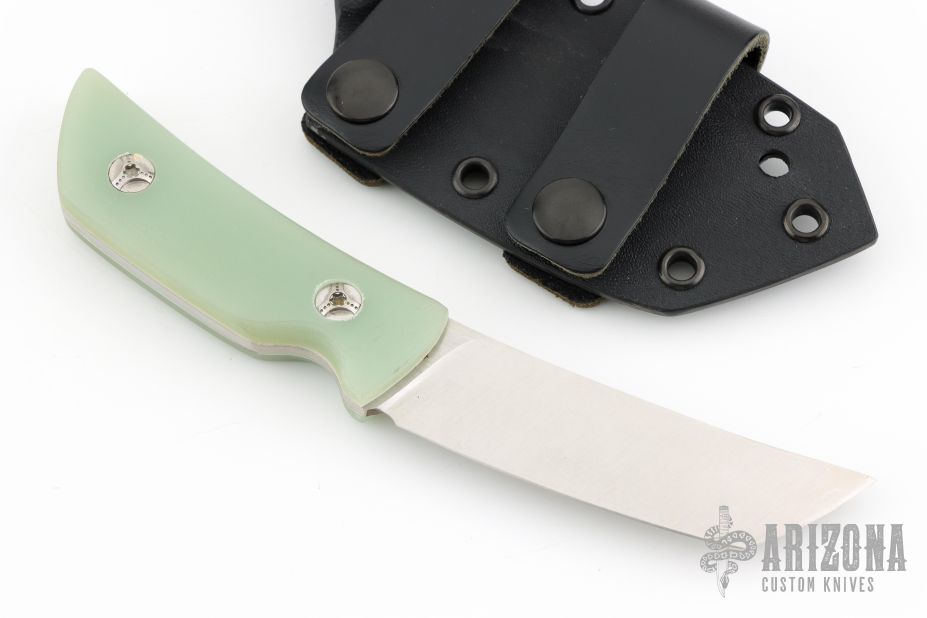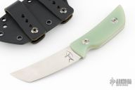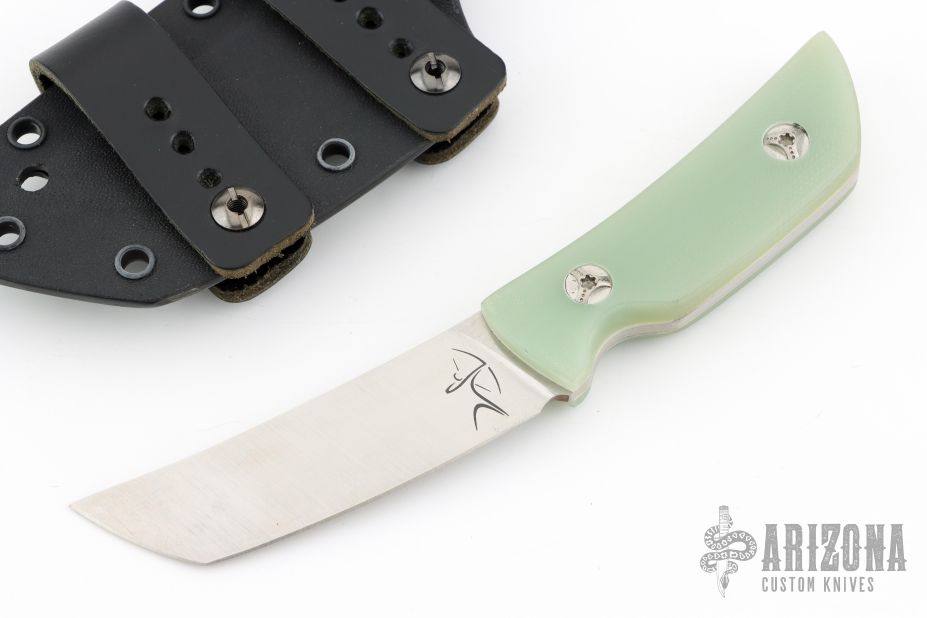 This Kwaiken by Orion Bladeworks features a satin finished blade with .115" blade stock and 1.027" blade depth, full tang construction with jade G-10 scales and white liners. Comes with a Kydex sheath. Has a few light sheath scratches, otherwise excellent condition.