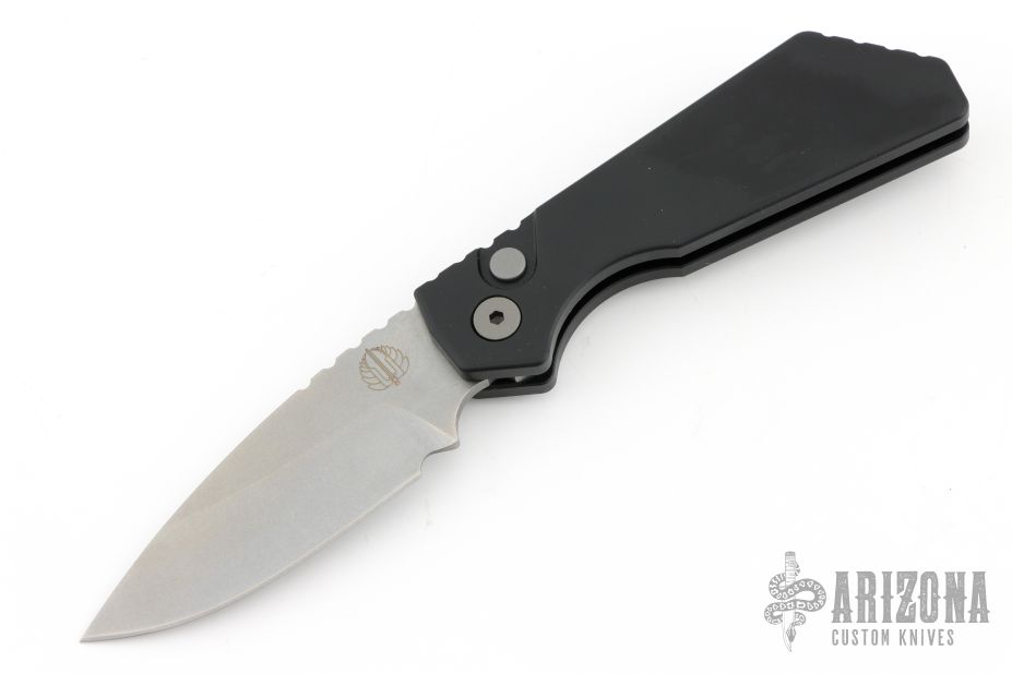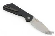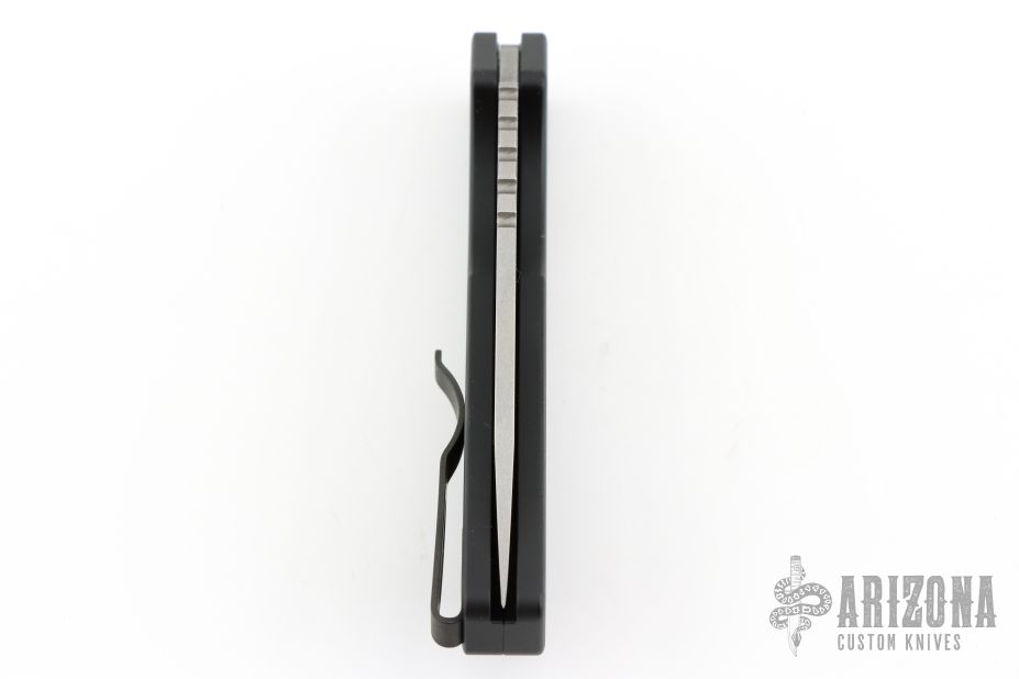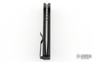 This Pro-Strider PT+ by Pro-Tech and Strider Knives features a tumbled finished blade with notched thumbrest. The handle has a black aluminum frame with bead blasted hardware and black stainless steel tip up clip. Comes with original packaging. Excellent condition.