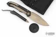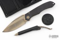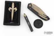This set from TKI 2015 is incredible. Comes with a bronze stonewashed ANAX with an integral black aluminum frame with lanyard hole. Nice detent, lockup and blade seating. Dagger logo on the blade along with s/n. B-side of blade has TKI logo. All hardware has been bronzed. Also comes with box, COA, bronzed titanium dagger logo patch, a black aluminum and flamed titanium Siphon pen, black Challenge Coin and black stonewashed titanium credit card knife with carbide edge. All items in set share a matching serial number. Comes with original box, and papers. Excellent condition. #55