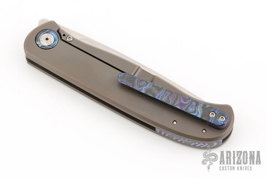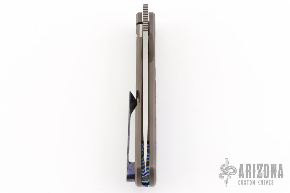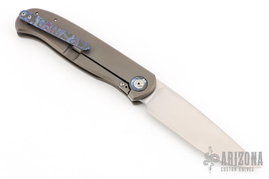 This Atlas SFL from Burger Knives features a hand rub satin finished drop point blade with notched thumbrest and front flipper. The handle has a bead blasted and milled titanium frame with black timascus inlay, pivot collars, tip up clip and backspacer with lanyard bail. Includes a zippered case and COA dated July 2021. Excellent Condition.