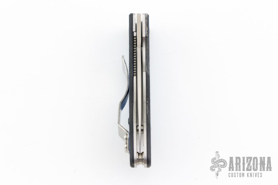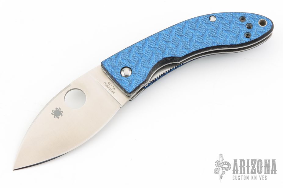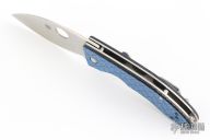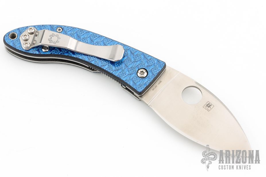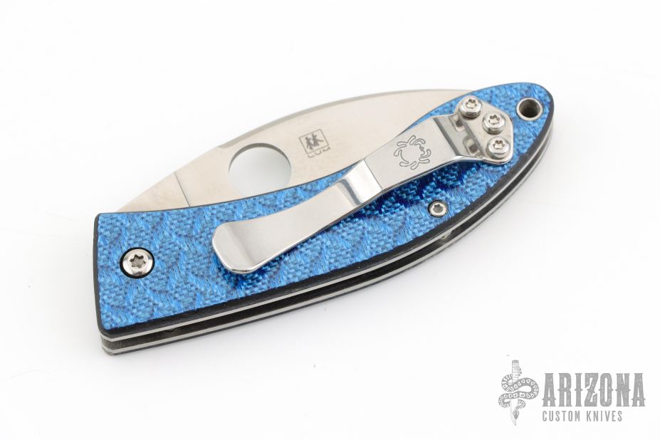 This Lil Lum Chinese folder from Spyderco has a satin finished blade with thumbhole and false top edge. The handle has blue carbon fiber scales, stainless steel liners, and a stainless steel tip up reversible clip. Excellent condition. Comes with original box and papers.