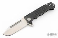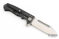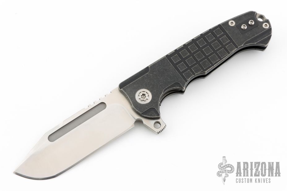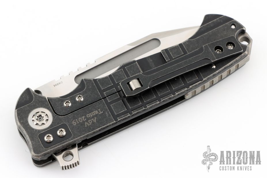 This ADV Tanto framelock flipper has a satin finished blade with swedge, fullers, notched thumbrest and flipper. Handle has a distressed titanium frame, titanium backspacer, and tip up clip with roller, anodized hardware. Rides on bearings, nice smooth action, detent, lockup and blade seating. Comes with maker's nylon zippered case. Excellent condition. Marked 2019 on the blade.