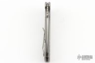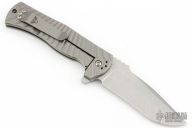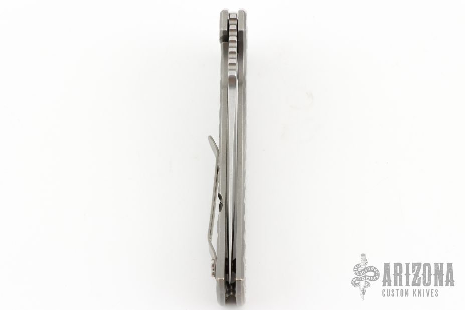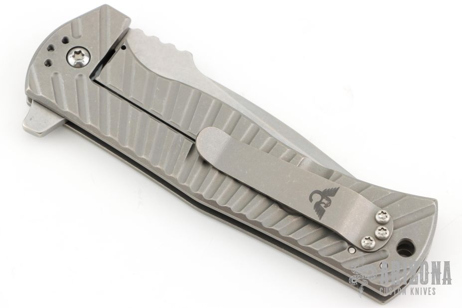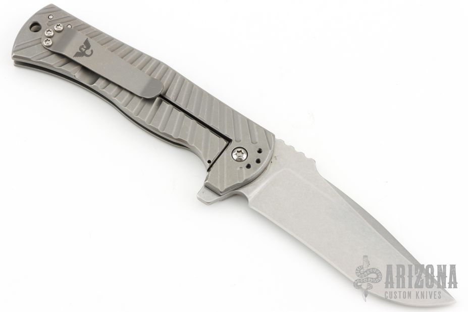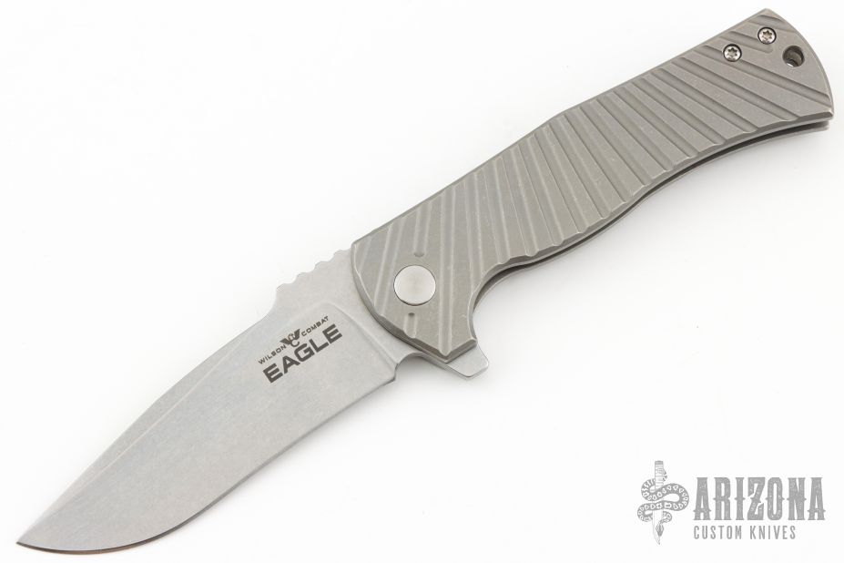 Les George design. The EAGLE is a rugged, framelock flipper design with the Wilson Combat signature Starburst Titanium handle pattern and Carpenter XHP “Super Steel” stainless tool steel recurve blade for the ultimate in edge holding and corrosion resistance. The handle of the EAGLE is precision machined and smooth tumble blasted lightweight Titanium with a robust integral framelock, chamfered lanyard hole and Titanium deep-pocket clip that can be positioned for blade tip up or down opening. The rugged open-frame construction makes it easy to clean trapped dirt and lint. Tumble finish blade rides on pure Teflon bearings for smooth action.