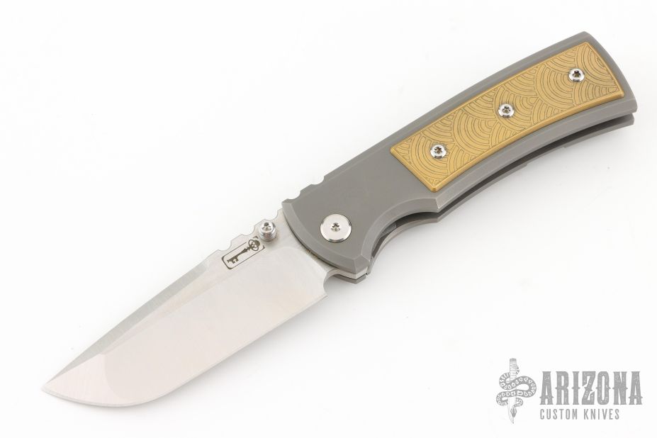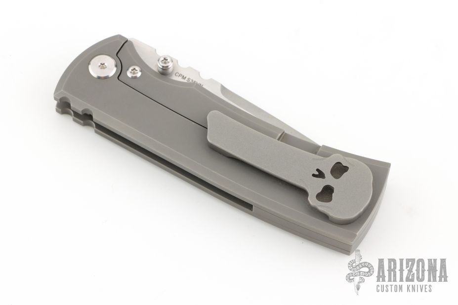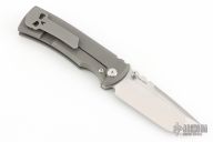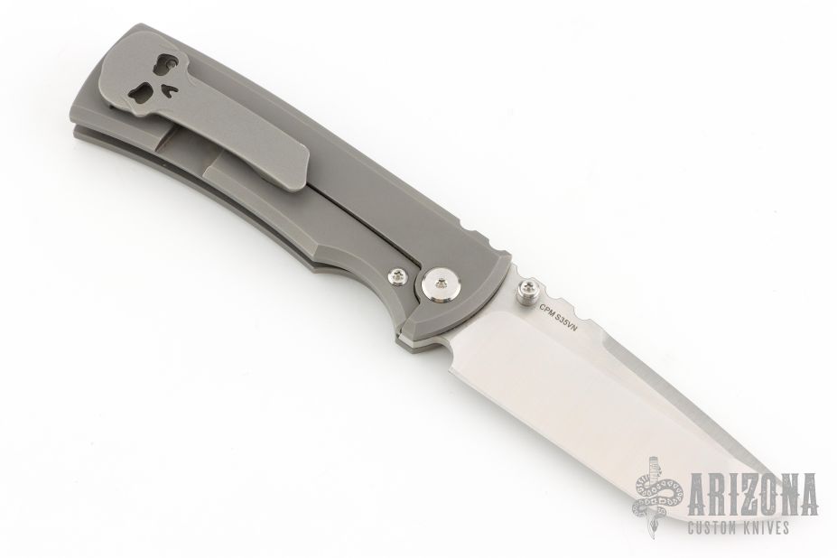 This Chaves Ultramar Redencion Street Tanto features a belt satin finished blade with the Chaves logo. The handle is made up of bead blasted titanium scales with laser engraved brass inlay on the presentation side, skull pocket clip with hidden screws (positioned for tip up carry), and matching titanium backspacer. Nice detent, lockup and blade seating. Excellent condition. Comes with original box.