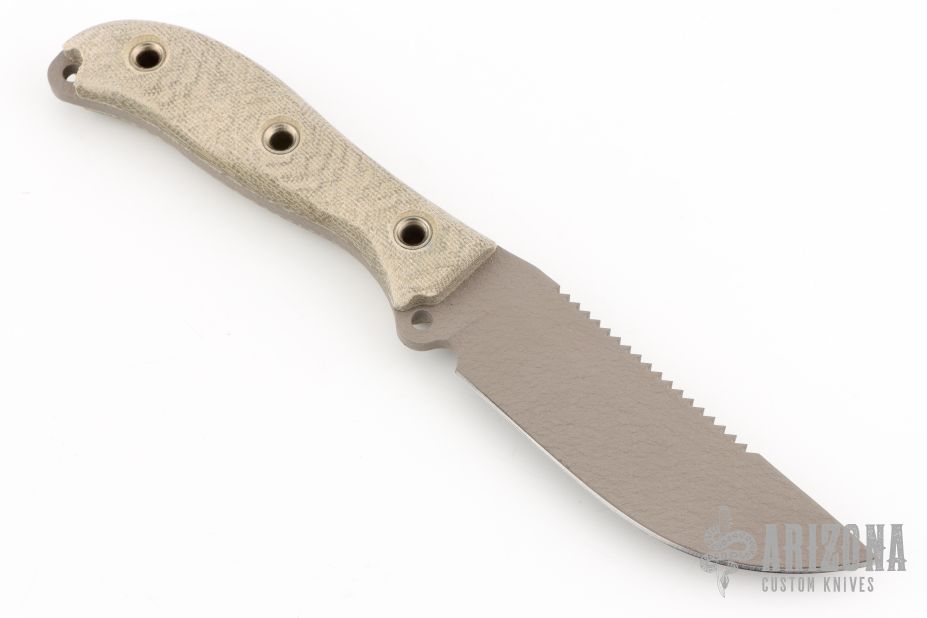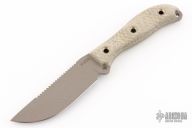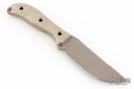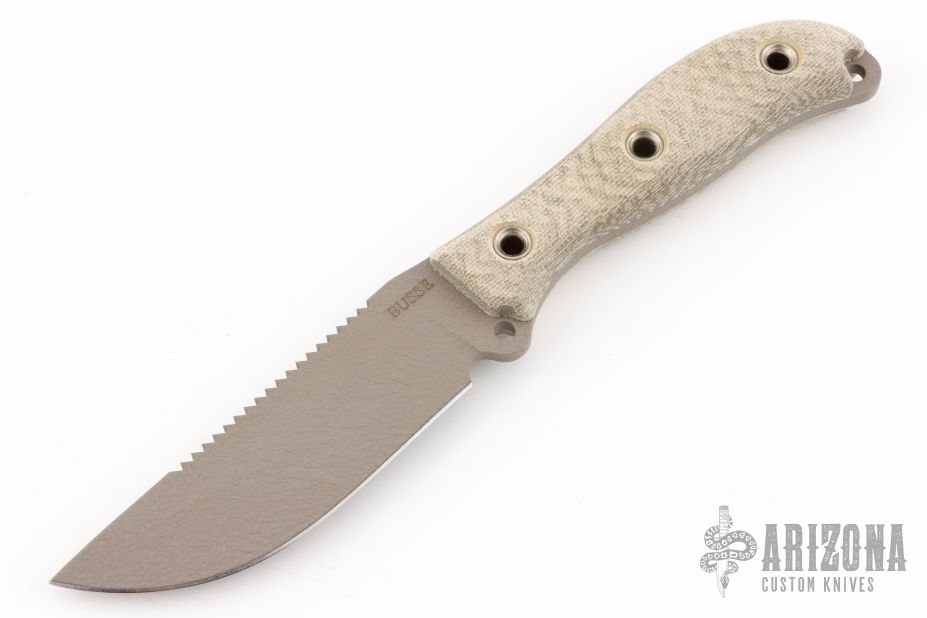 This Saw of Duty by the Busse features a sage coated blade with sawteeth, .170" blade stock, 1.227" blade depth, full tang construction with light green canvas micarta scales and a lanyard hole. Excellent condition.