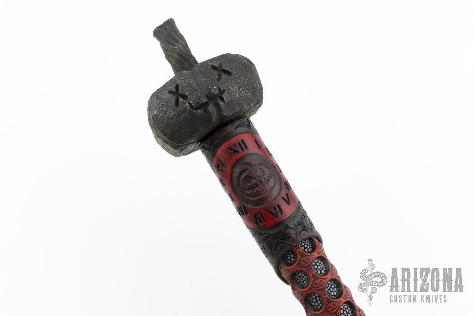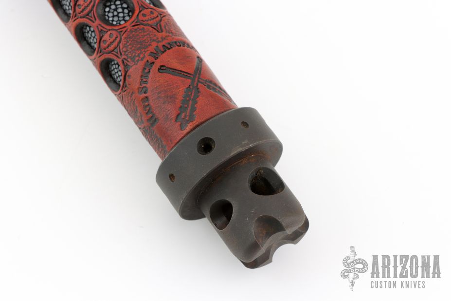 This Pumpkin Stick by Hate Stick Manufacturing Co. features a distressed finished carved pumpkin head. Sling bay base wrap, Brown/Black/Red leather grip with windowed pumpkin work and Doom Pumpkin Overstrike. Very Cool. Comes with Maker's dogtag. Excellent condition.