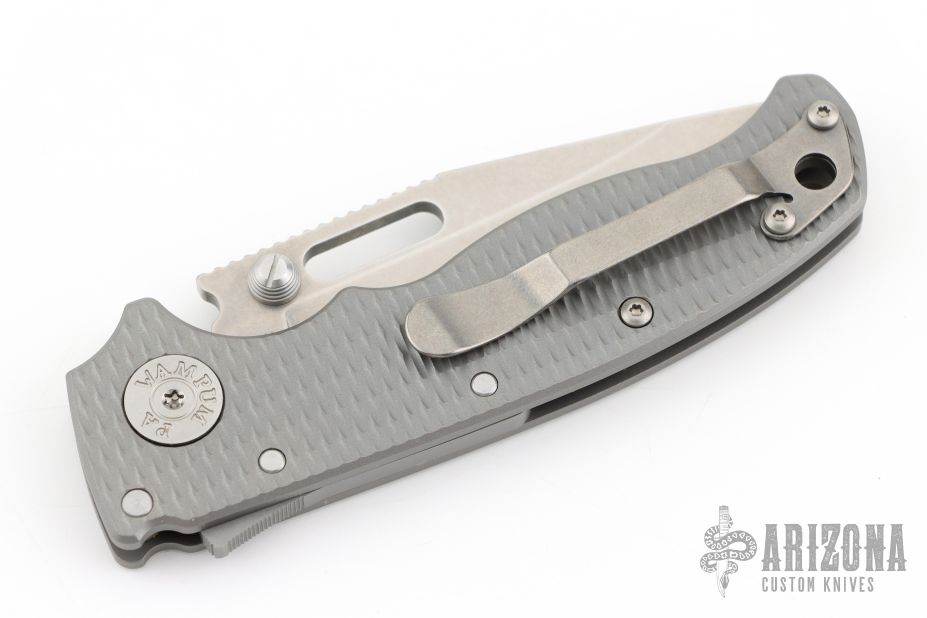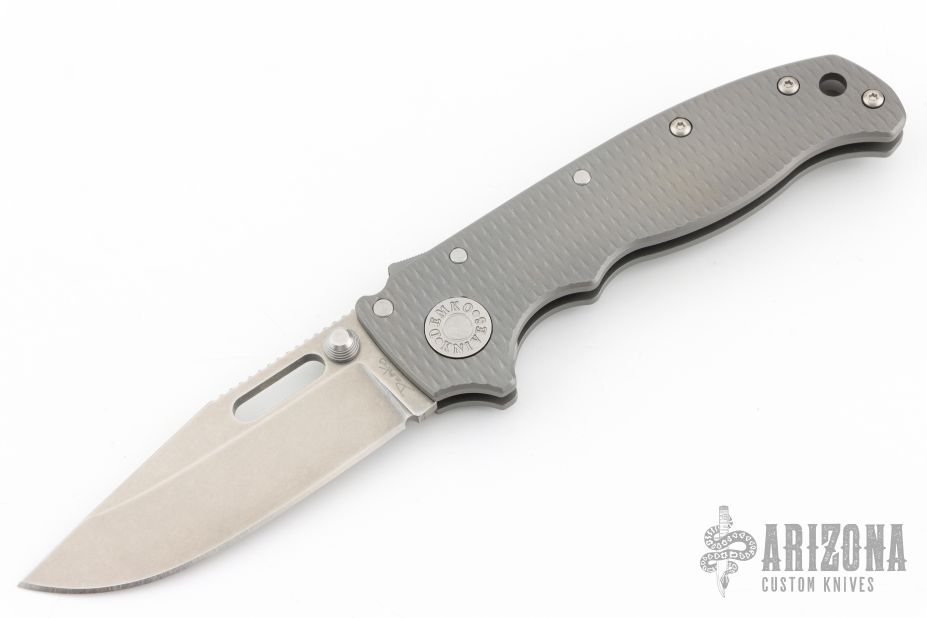 The AD20.5 by Demko Knives features the impressive Shark Lock and an even more impressive price point. The Shark Lock mechanism is situated on the spine of the knife and operated with a ramp-like ‘fin’, allowing you to flip the blade open and closed at will. It's probably the best thing about this knife and design, how quickly it can be deployed and ready for action. It acts as a blade launcher and a little wrist action is all it needs. Comes with original box and extra clip. This one has a stonewashed blade and bead blasted and textured titanium handle. Excellent condition.