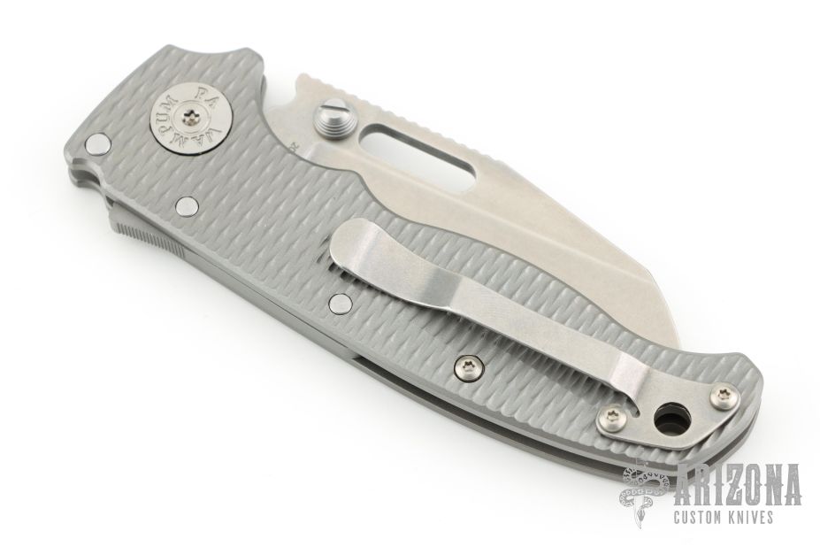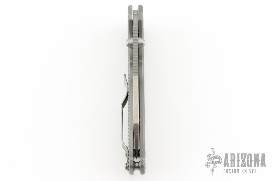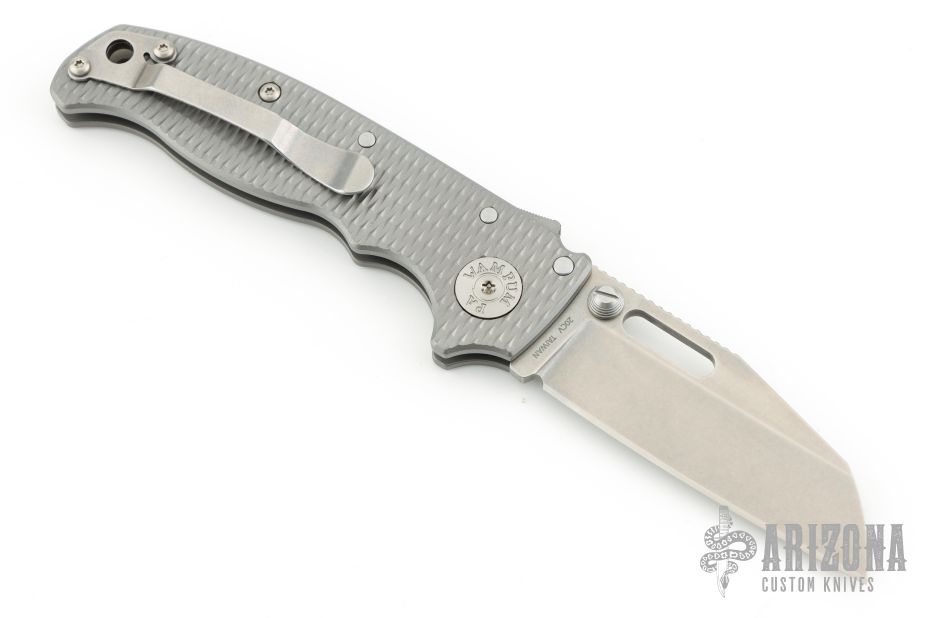 The AD20.5 by Demko Knives features the impressive Shark Lock and an even more impressive price point. The Shark Lock mechanism is situated on the spine of the knife and operated with a ramp-like ‘fin’, allowing you to flip the blade open and closed at will. It's probably the best thing about this knife and design, how quickly it can be deployed and ready for action. It acts as a blade launcher and a little wrist action is all it needs. Comes with original box and extra clip. This one has a stonewashed blade and bead blasted and textured titanium handle. Excellent condition.