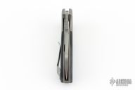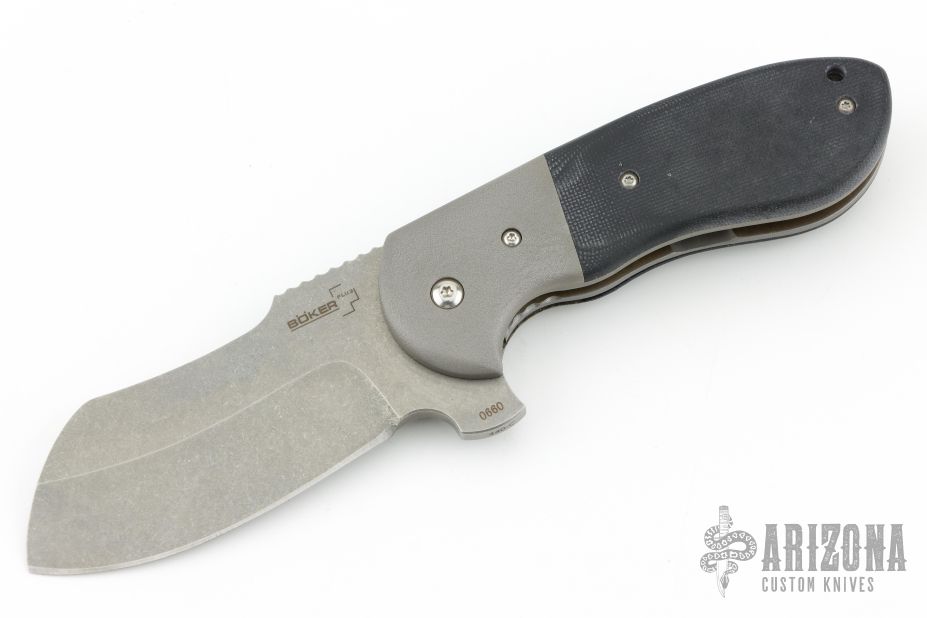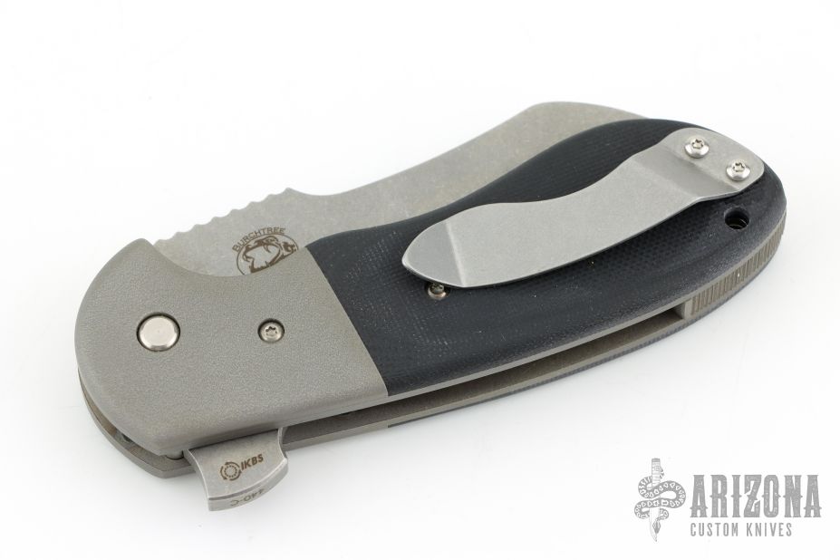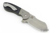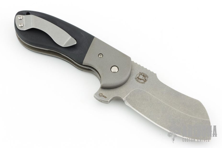 This knife features a stonewash finished sheepsfoot blade with notched thumbrest and flipper. The handle has orange peel textured stainless steel bolsters, black G-10 scales, bead blasted stainless steel liners and backspacer, and a tip up stonewashed stainless steel clip. #0660, features IKBS. Comes with original box. Excellent condition.