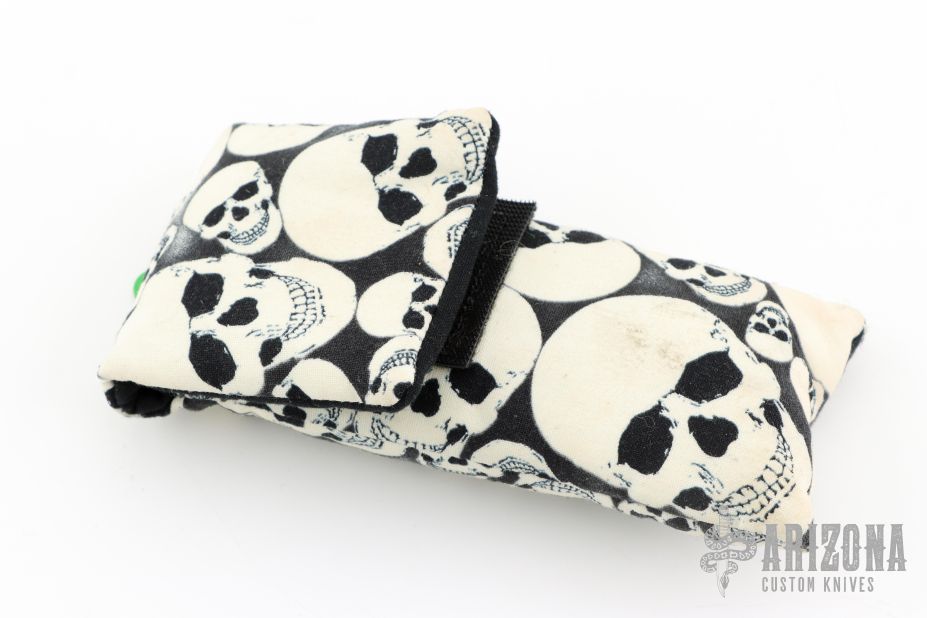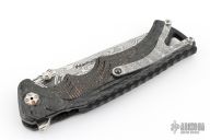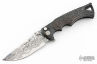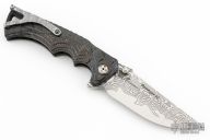 This Tighe Fighter Flipper by Brian Tighe features a polished Damasteel blade with notched thumbrest and flipper tab. The handle has milled carbon fiber scales, notched g10 backspacer and a tip up Damasteel clip with ceramic ball, lanyard hole at the butt. Nice action, lockup and blade seating. Comes in a velcro knife case with skulls. Excellent condition.