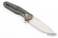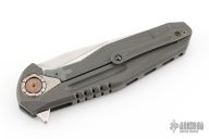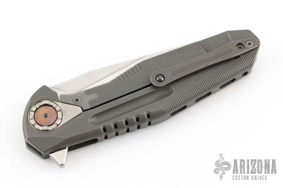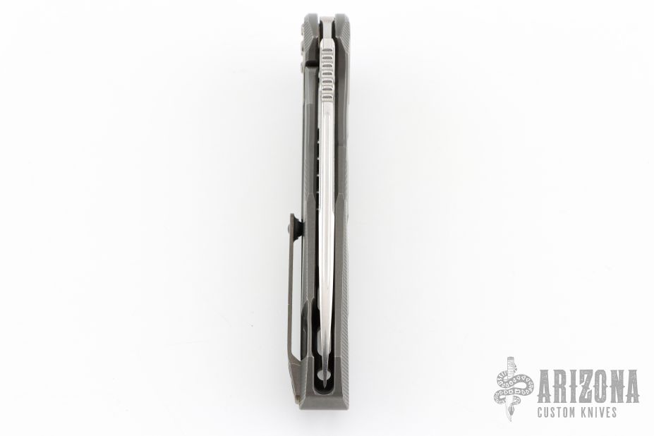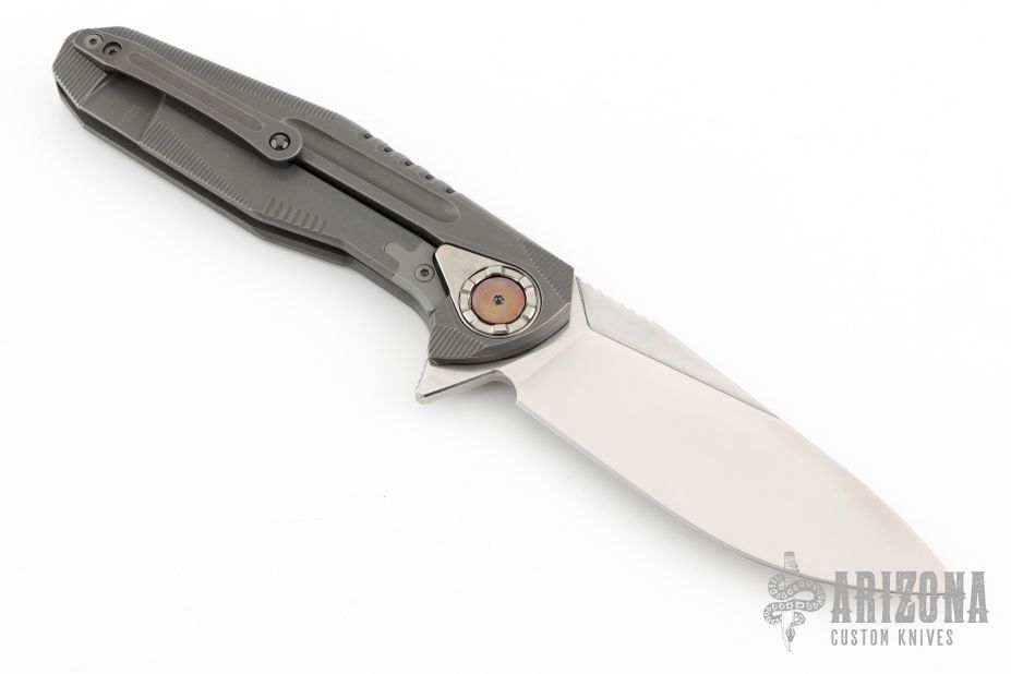This Thor4L by Rike Knife features a polished drop point blade with notched thumb rest and flipper. The handle comprises integrally constructed machined titanium. The matching clip is positioned for tip up carry. Includes original leather slip case, microfiber cloth and zipper case. Has a couple light scratches, otherwise Excellent condition.