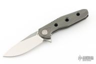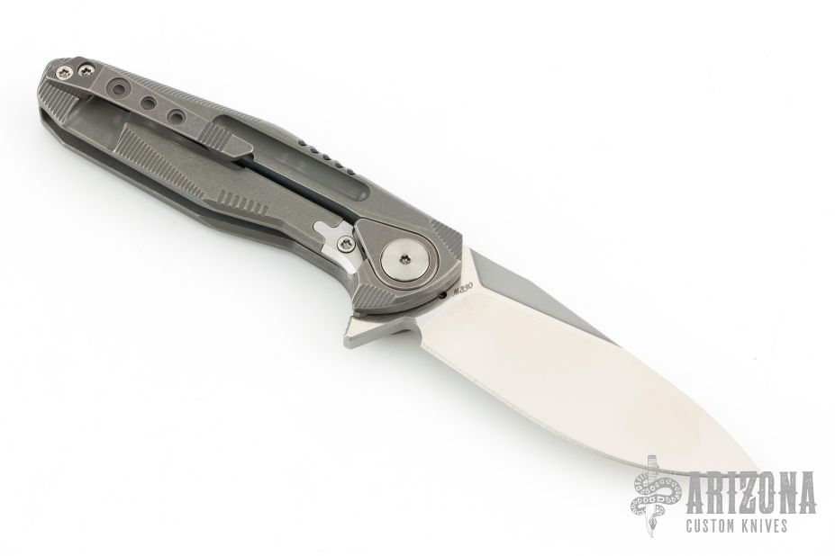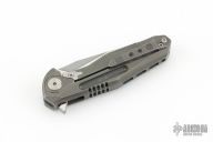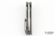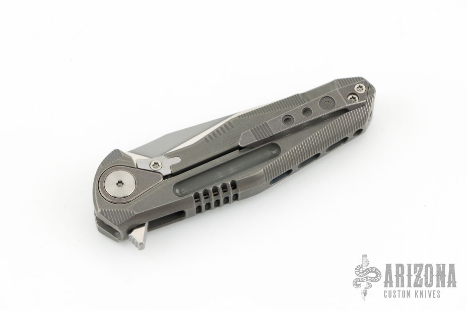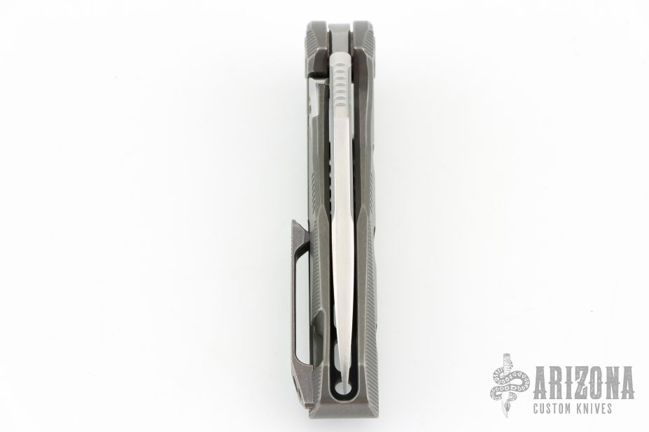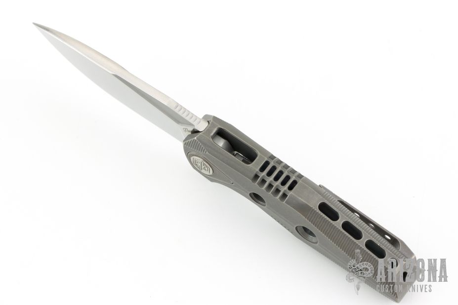 This Thor4S by Rike Knife features a satin finished drop point blade with notched thumb rest and flipper. The handle comprises integrally constructed machined titanium. The matching clip is positioned for tip up carry. Includes original leather slip case, microfiber cloth and zipper case. Has a couple light scratches, otherwise Excellent condition.