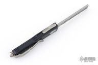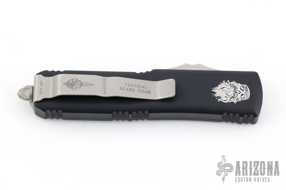 This UTX-85 OTF automatic Tactical Beard Comb by Marfione Custom Knives features a fine tooth hand ground stonewashed comb blade, and a black aluminum handle with tip down bead blasted stainless steel clip. Dated 04/2018 #587. Comes with original box, zippered case, and COA. Excellent condition.