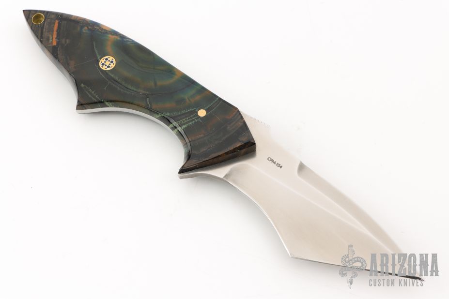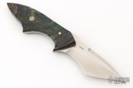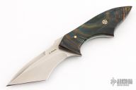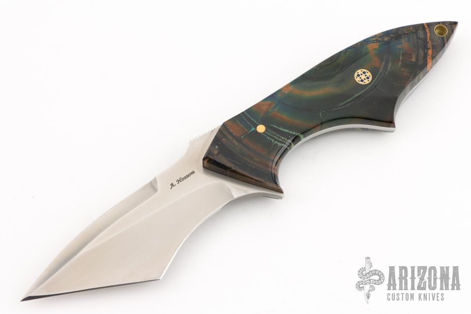 This Dogtag by Alex Hossom features a hand rub satin finished blade with sharpened top edge and notched thumbrest, .142" blade stock and 1.262" blade depth, full tapered tang construction. The handle has stabilized cross-cut mammoth ivory scales with mosaic and brass pins. Comes with a zippered case. New from maker at the 2025 Blade Show.