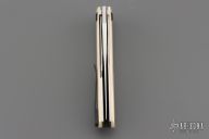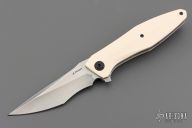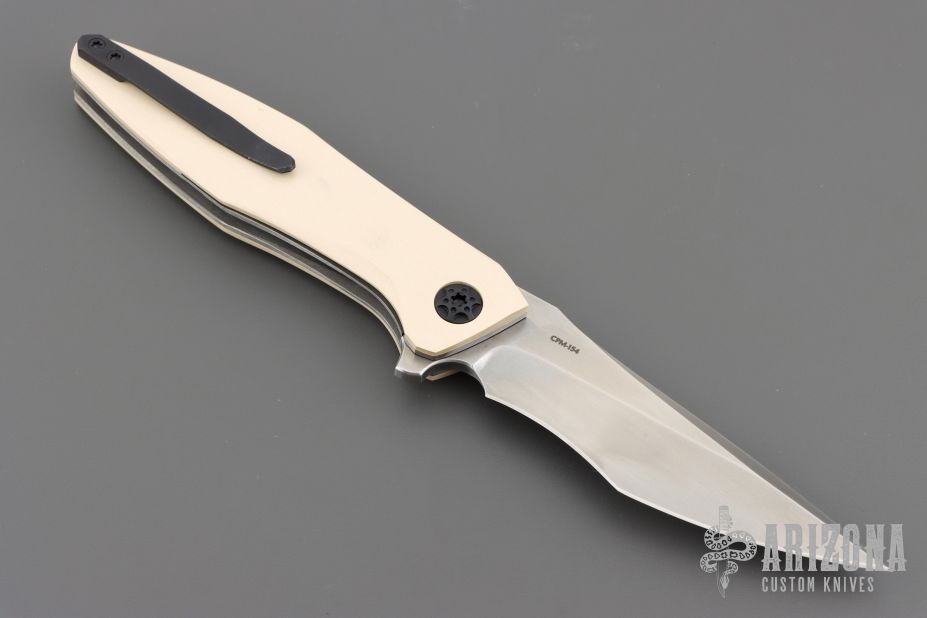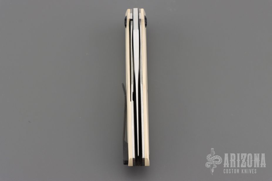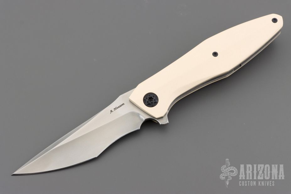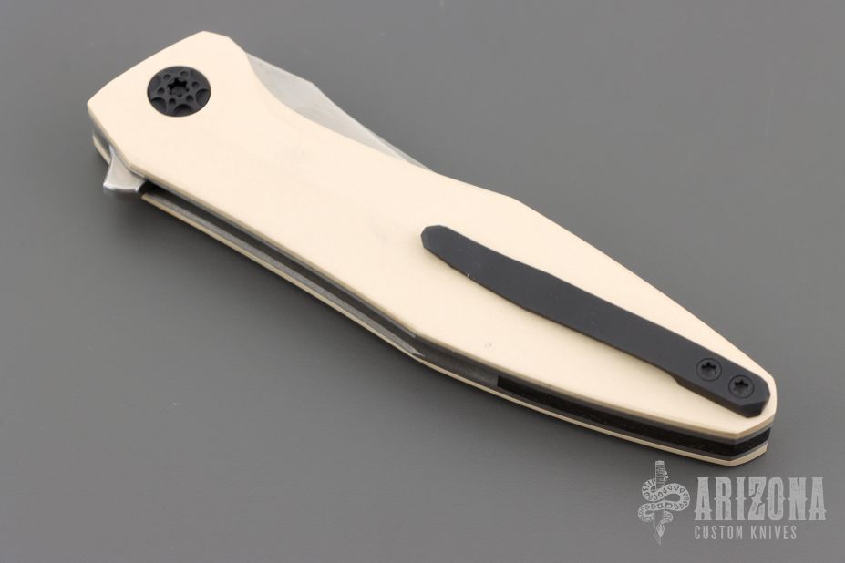This Primo Linerlock flipper by Alex Hossom features a matte finished blade with flipper. The handle has ivory paper micarta scales, titanium liners, black wood (bog oak?) backspacer, blackened titanium hardware and tip up clip. Comes with a zippered case. Rides on bearings, nice detent, lockup and blade seating. New from maker at the 2025 Blade Show.