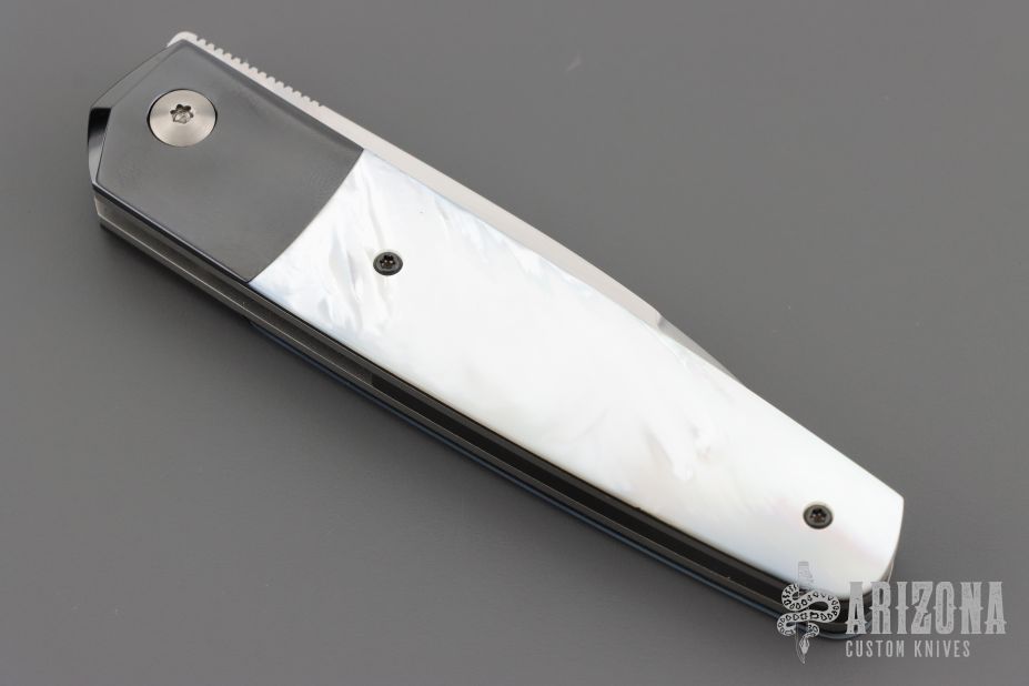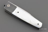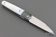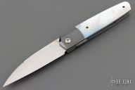 This Front Flipper by Stephane Sagric features a hand rub satin finish wharncliffe blade with swedge and notched thumbrest, front flipper style opening. The handle has dovetailed zirconium bolsters, mother of pearl scales with black liners, blasted titanium liners, zirconium backspacer. Rides on bearings, nice detent, lockup and blade seating. Comes with leather case. Excellent condition.