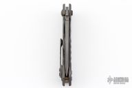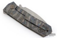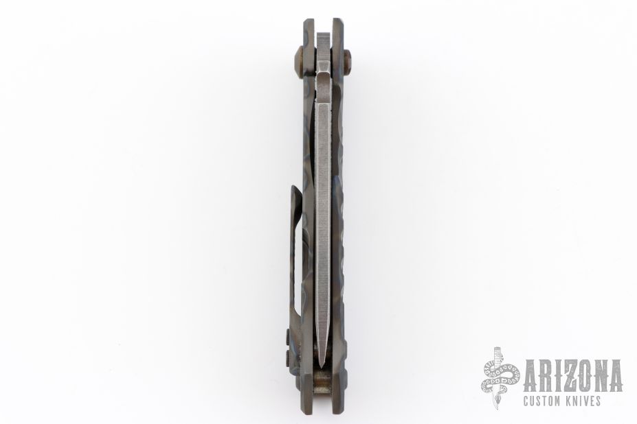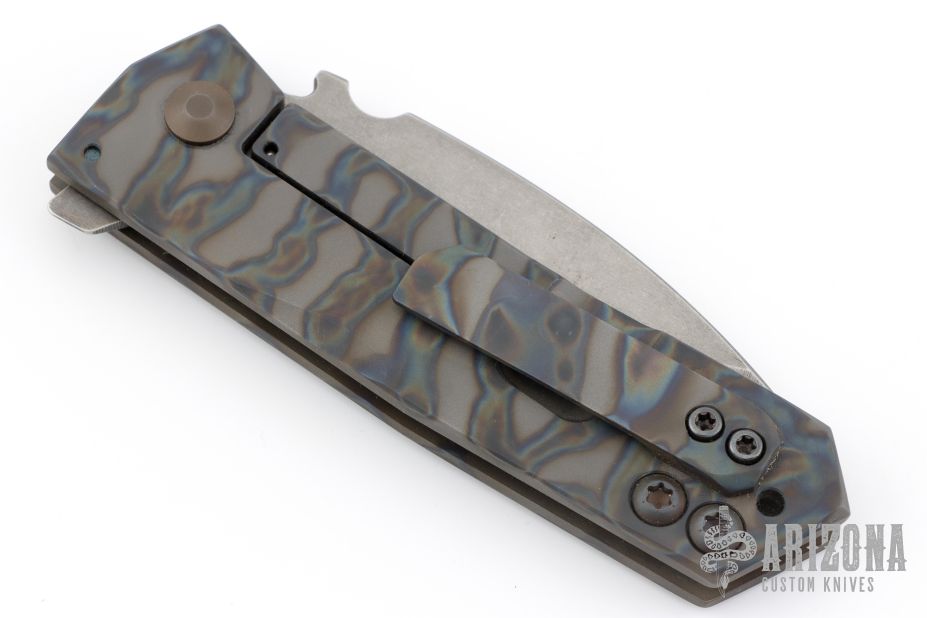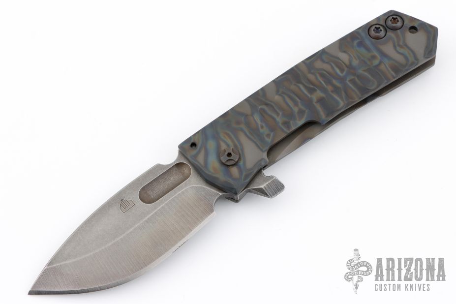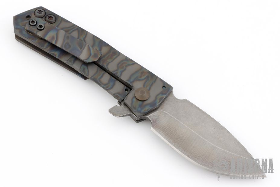 This FIFP (Fear is For Prey) framelock flipper by Crusader Forge features an acid etched drop point blade with thumb hole.  The handle features a milled titanium frame with flame anodized finish, and a matching tip up pocket clip. Comes with original box and maker's card (the COA portion of the card is for the wrong knife). Has a couple light scuffs, excellent condition otherwise.
